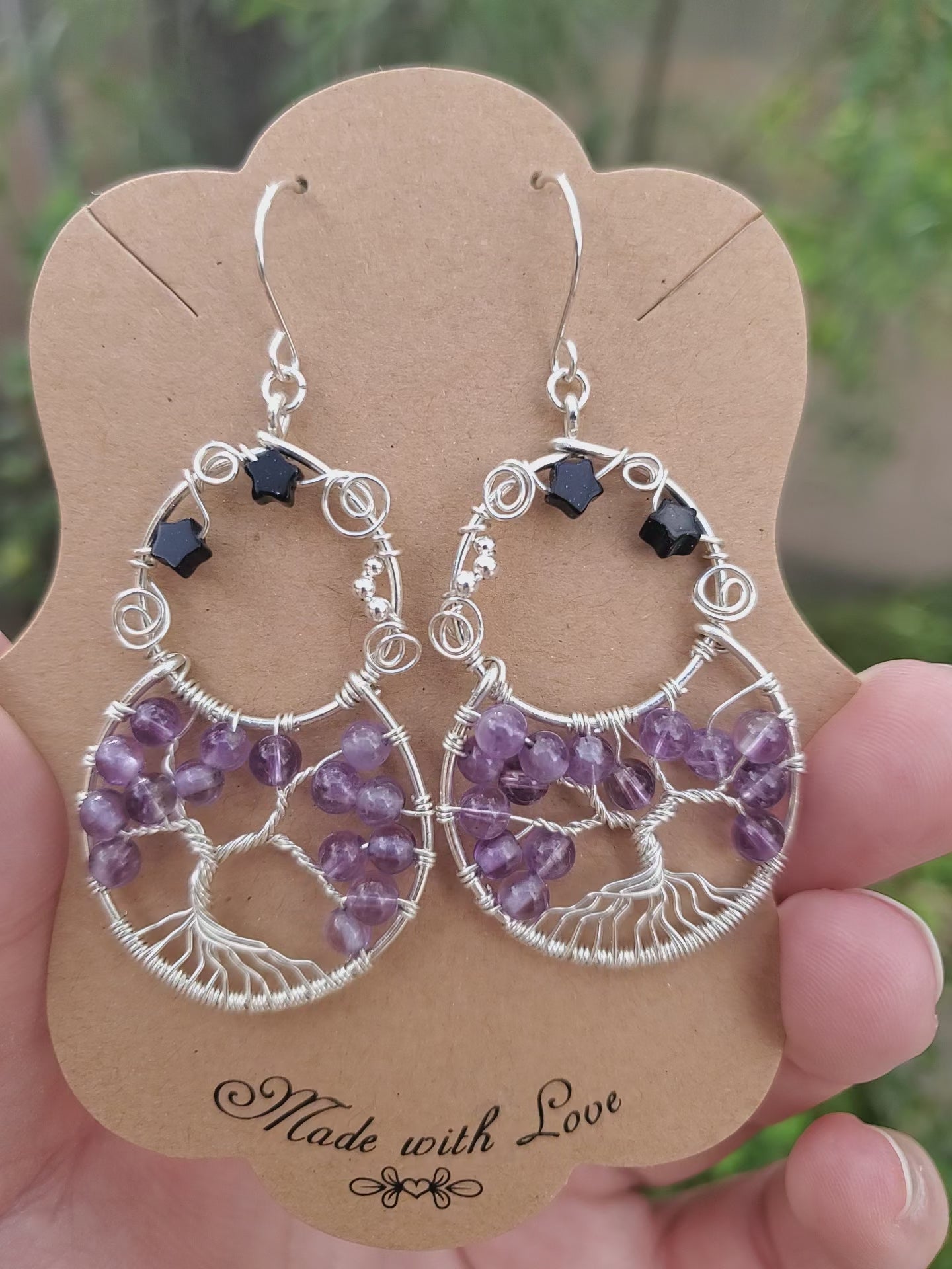 These tree earring have amethyst beads in 925 sterling silver with blue Goldstone stars and sterling silver beads. 100% handmade.