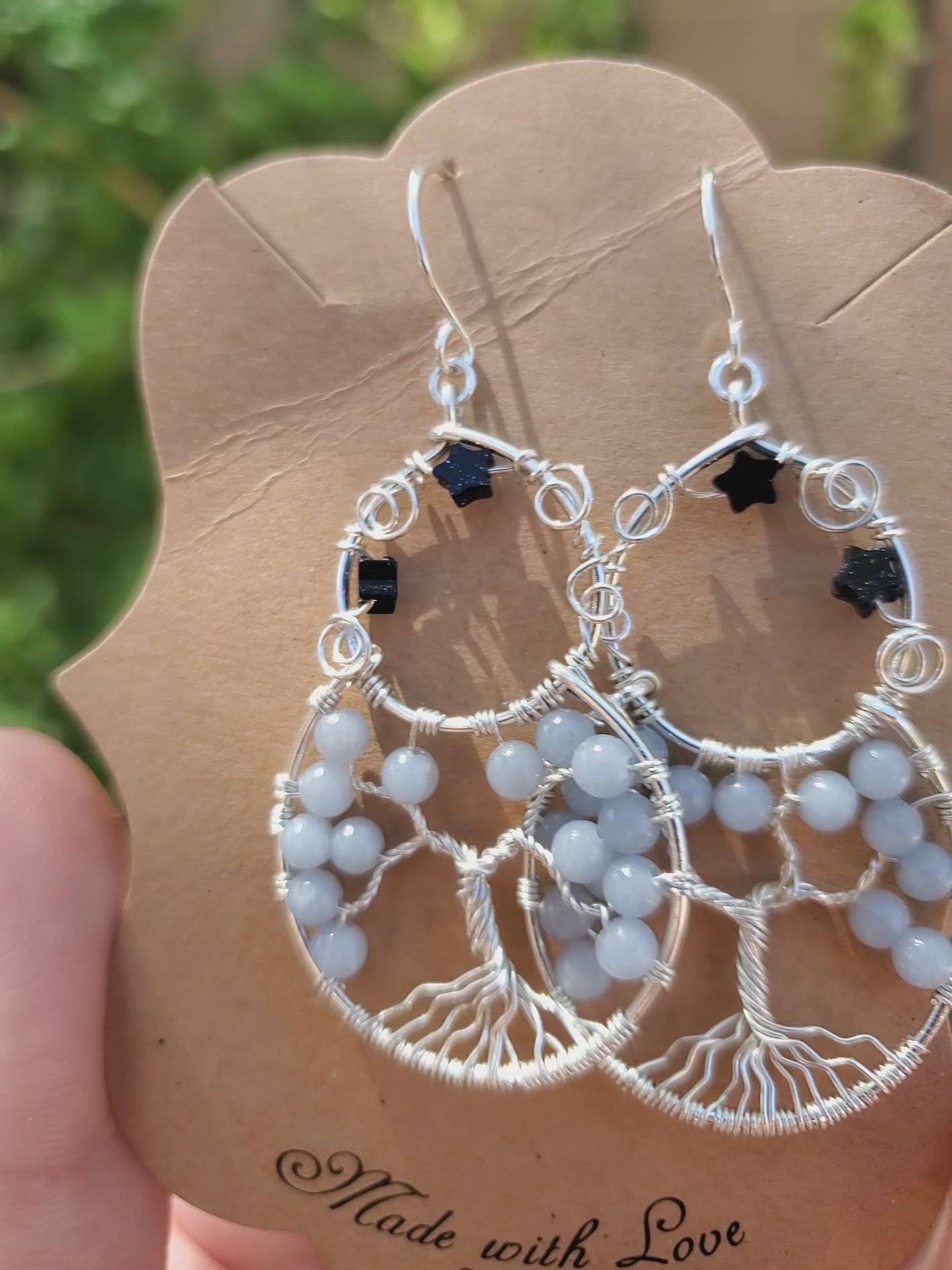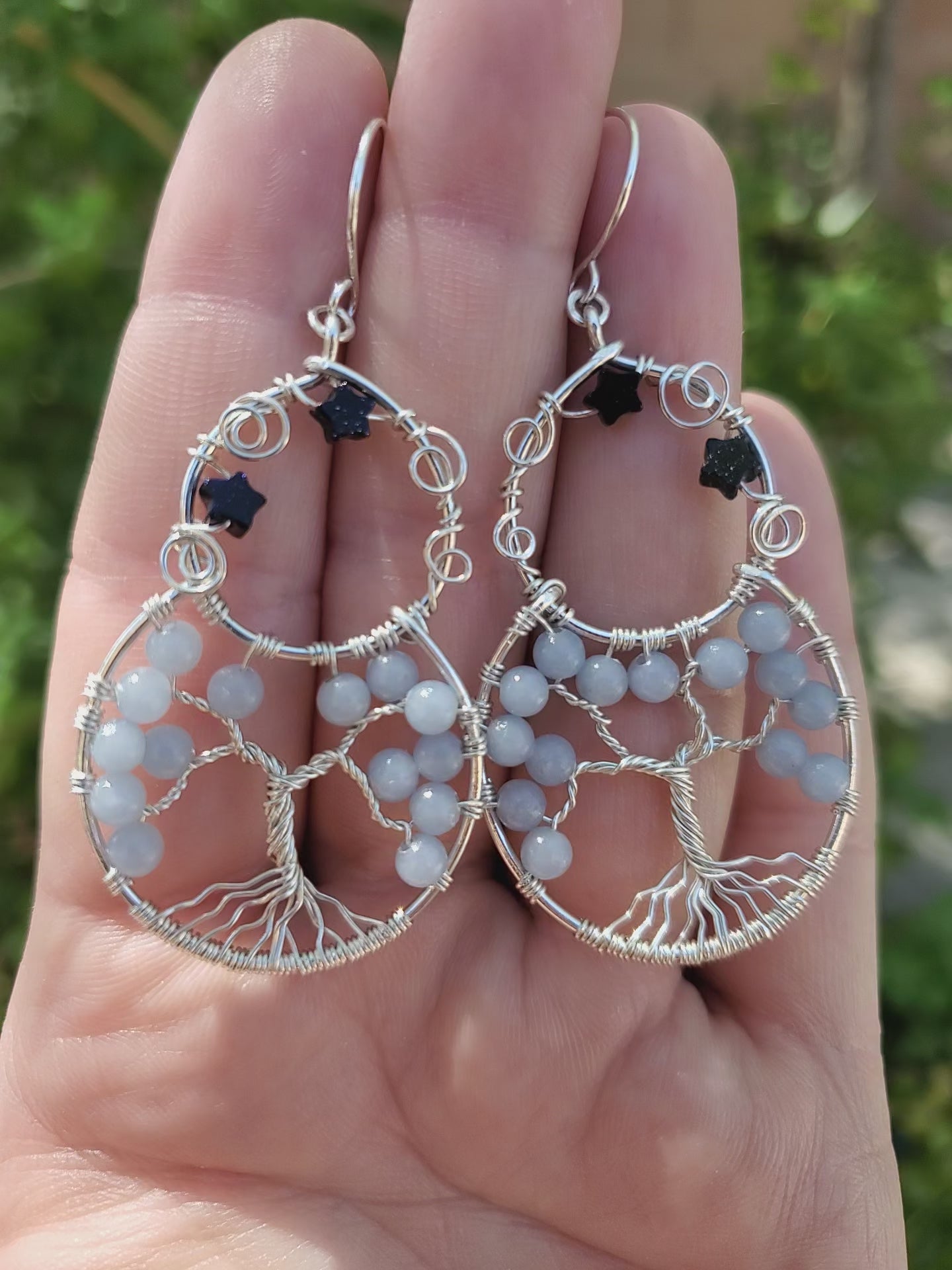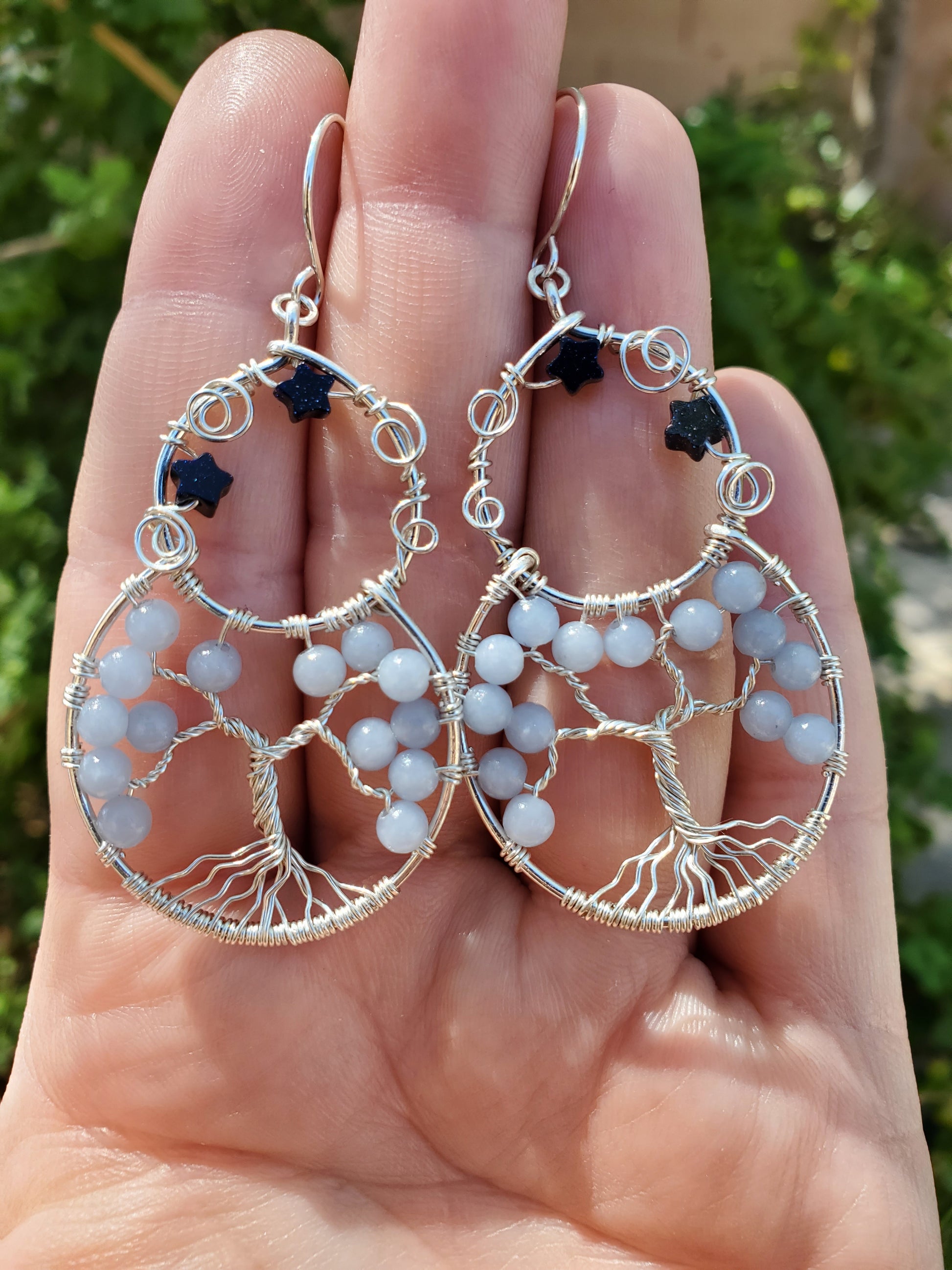 These tree earring have baby blue angelite beads in 925 sterling silver with blue Goldstone stars. 100% handmade.