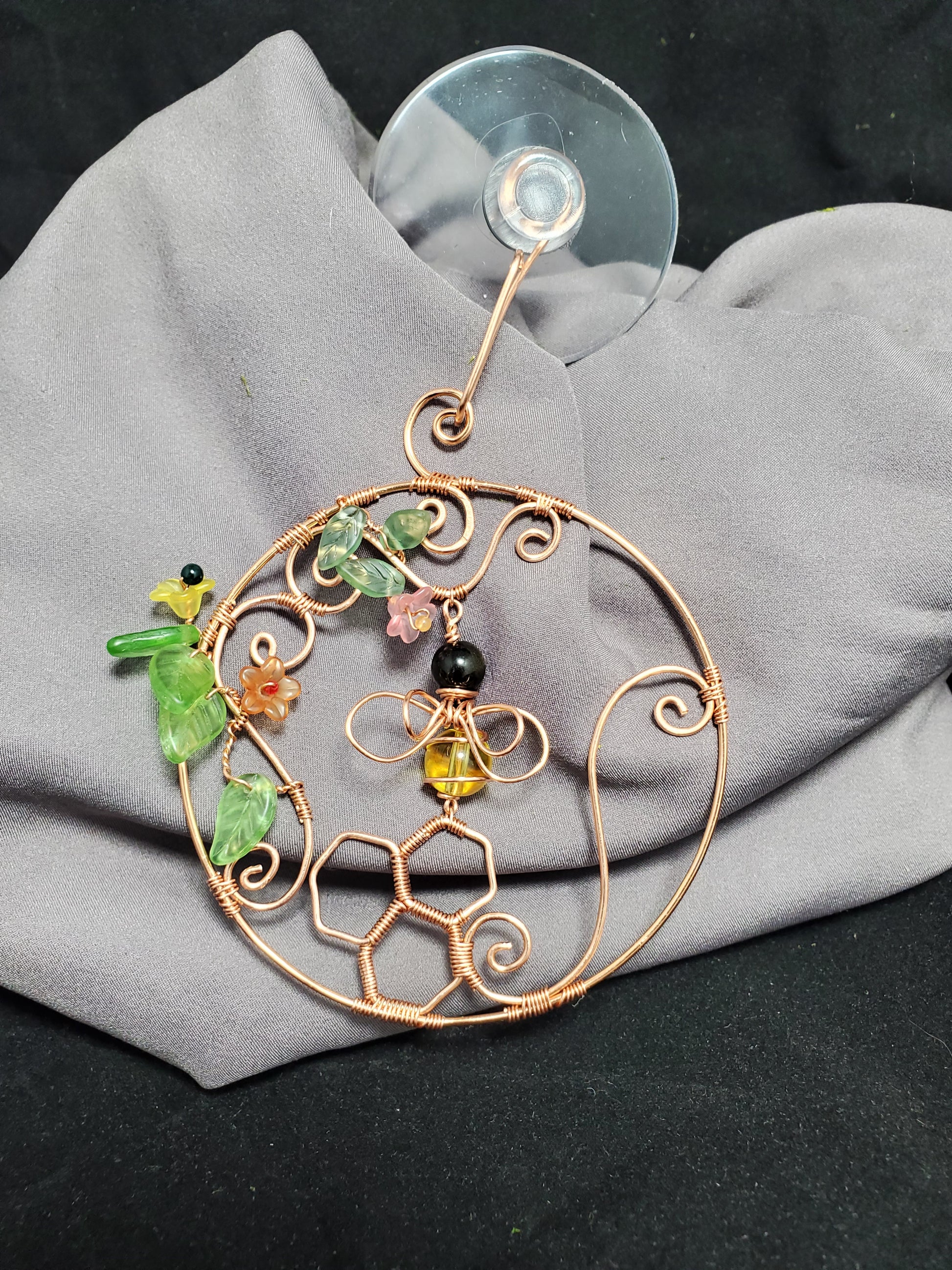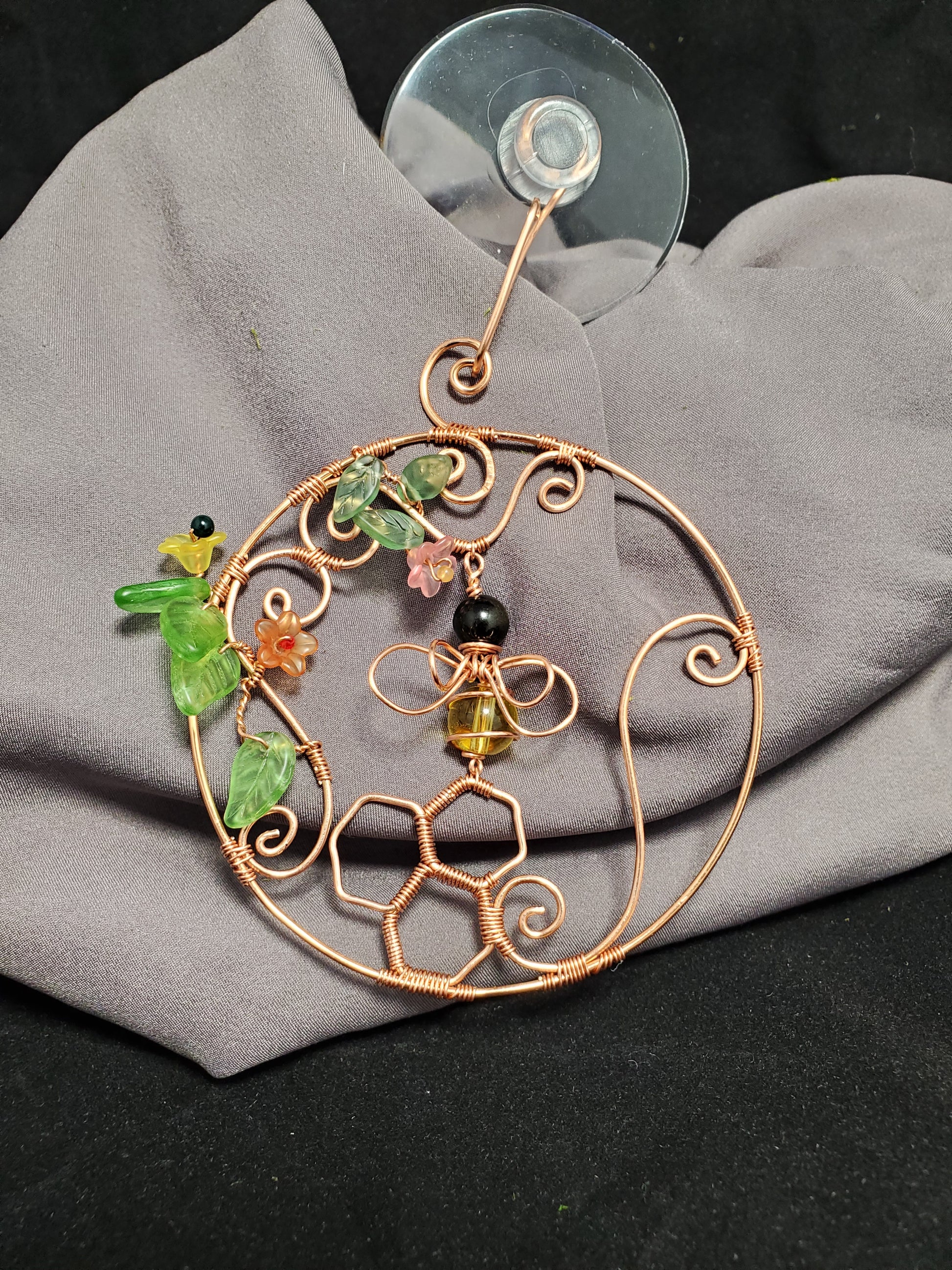 This bee suncatcher is made with copper wire, lucite flowers, frosted glass leaves, the beads in the flowers are: red aventurine, moss agate, and red Czech crystal, or citrine. The bee is made with a yellow glass bead, a black onyx bead, and a gold sheen obsidian bead.