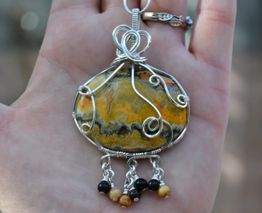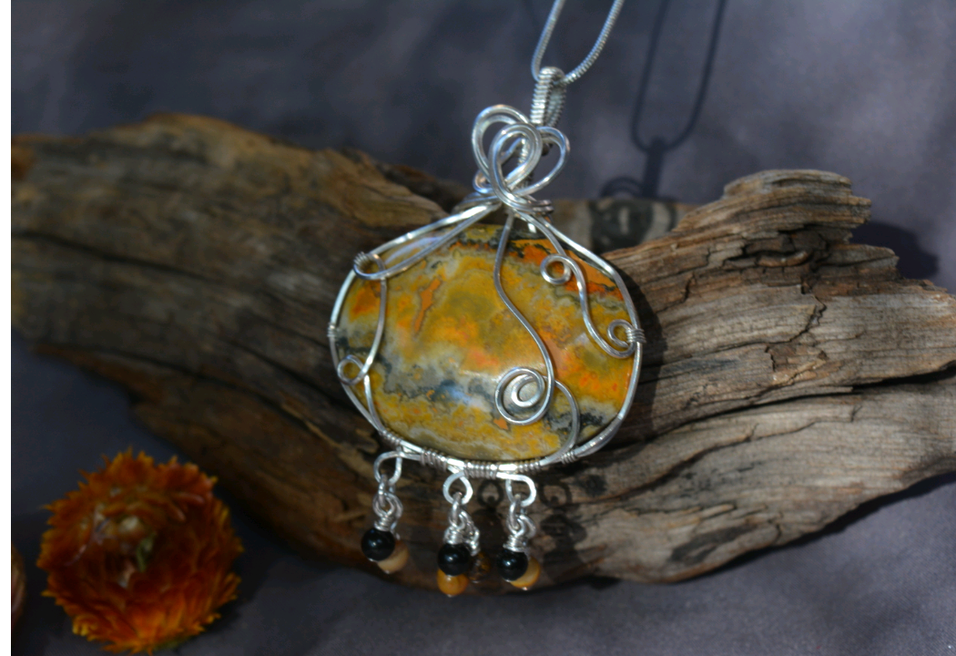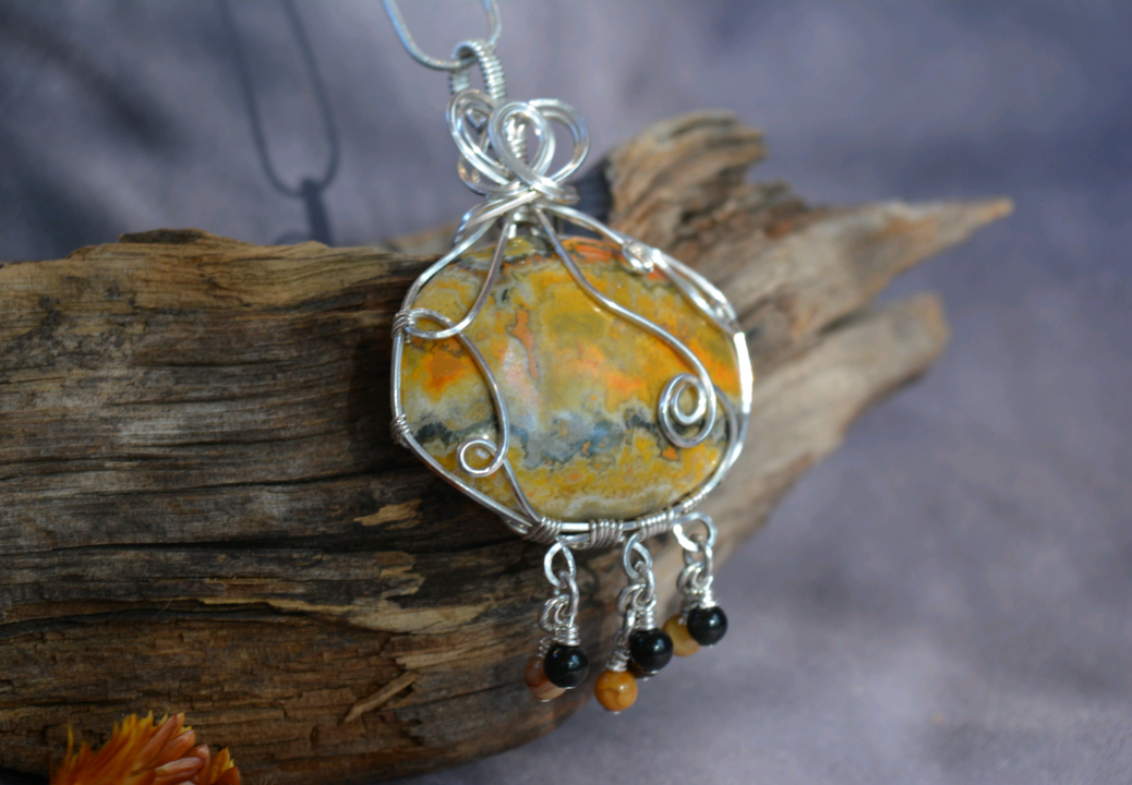 A bumblebee jasper cabochon wrapped in 925 sterling silver wire, with hand-made chain links dangling obsidian, bronzite, and yellow crazy lace agate beads.