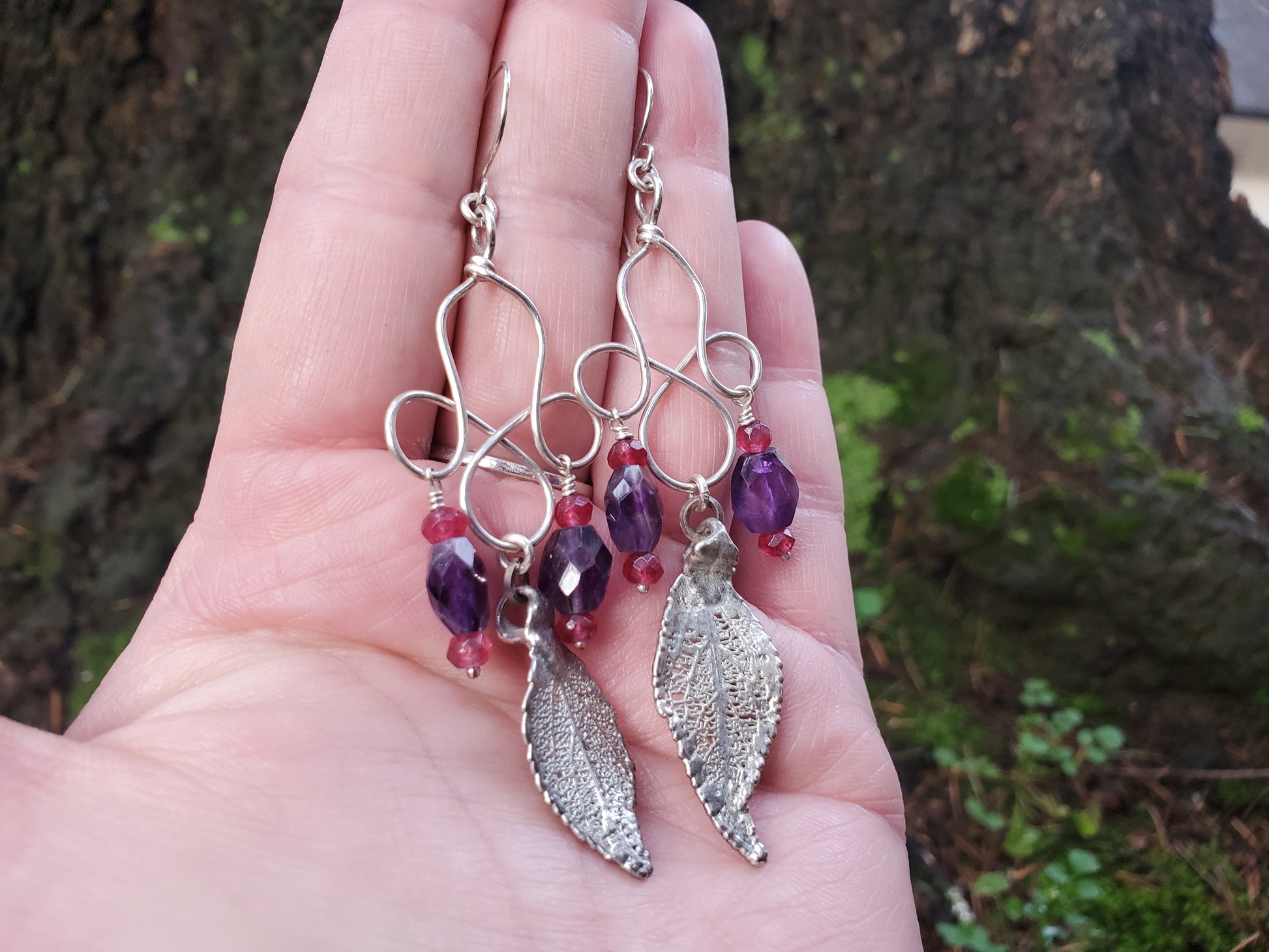 These earrings are made with amethyst and garnet in 925 sterling silver with fish hook ear wires. The leaves are real leaves, electroplated with sterling silver.