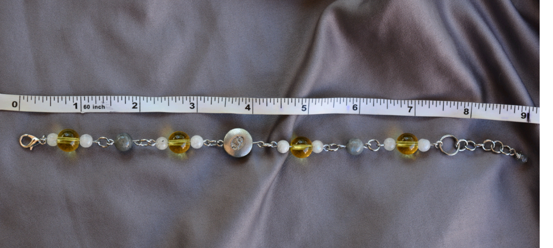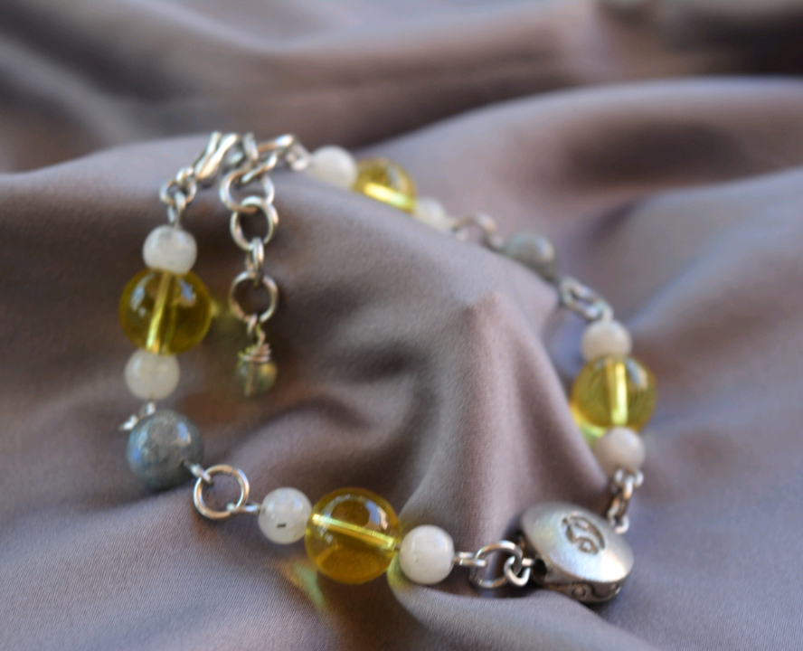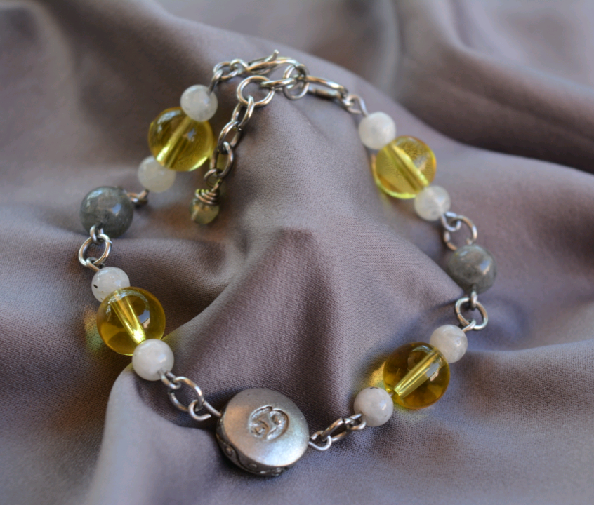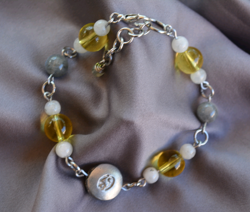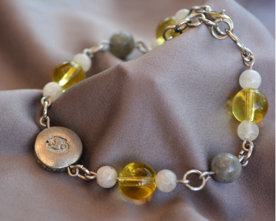 Stainless steel links bracelet with pewter Cancer Zodiac charm and milky white moonstone, yellow citrine, and gray labradorite beads.