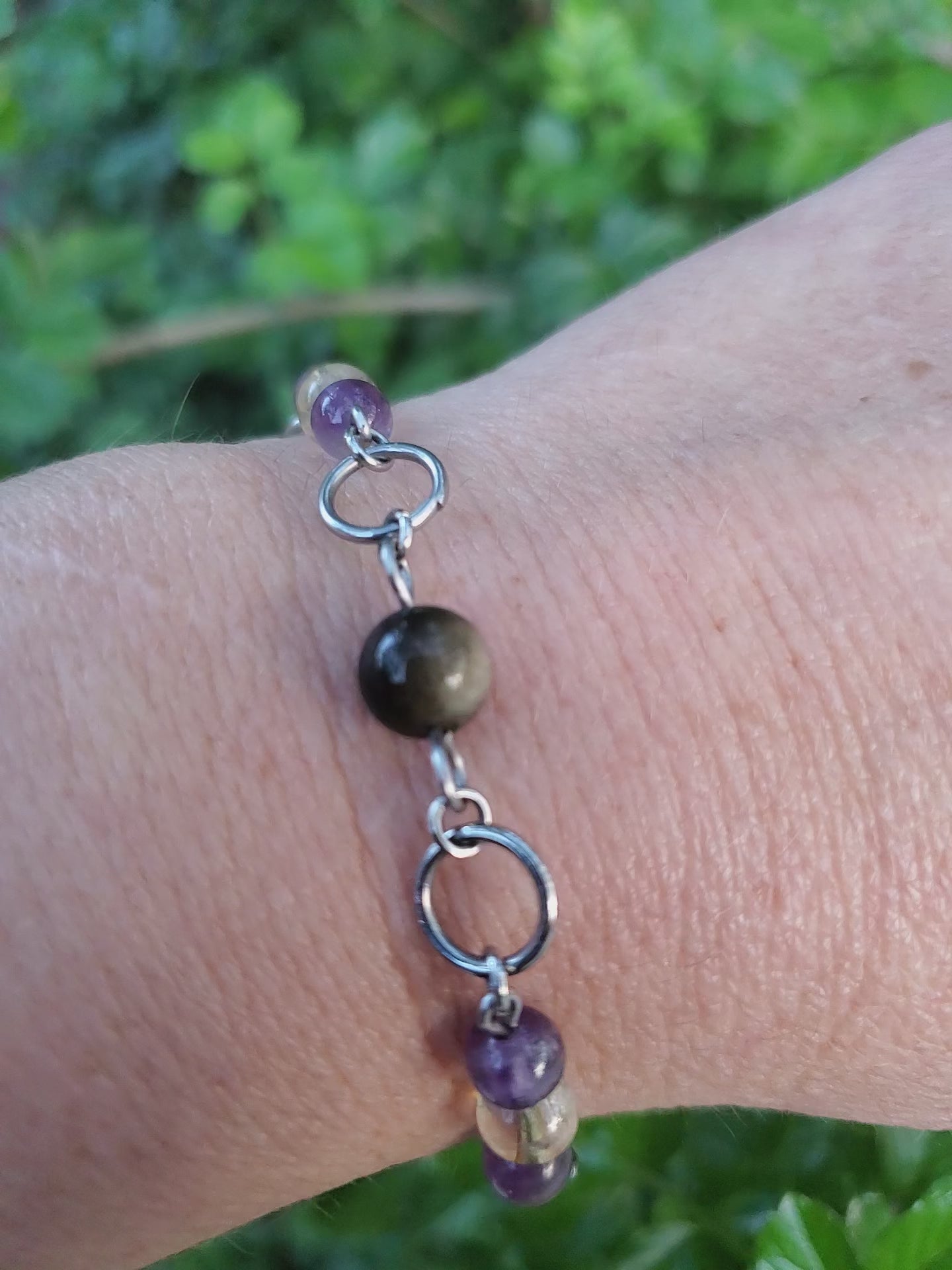 Stainless steel link bracelet with gold sheen obsidian, AA moonstone, amethyst, and citrine. Adjustable length with tail did ease of taking on and off, with lobster clasp closure.