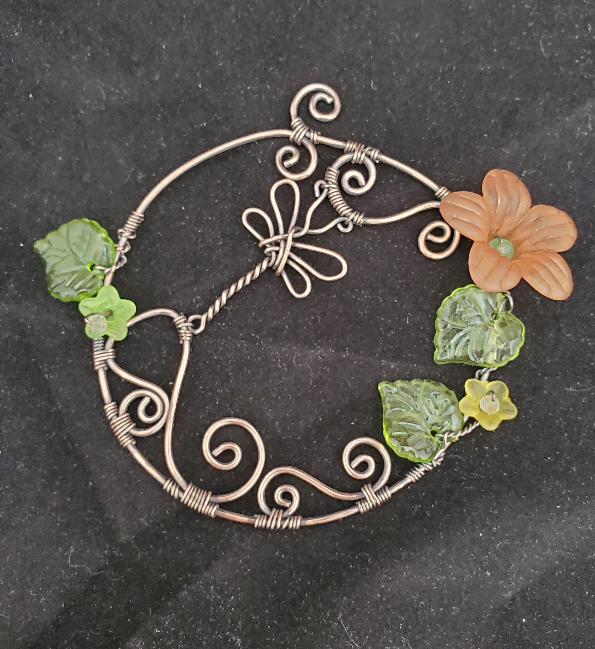 The dragon fly suncatchers are made of antiqued and polished copper wire with lucite flowers and leaves, a green aventurine bead in the large flower and citrine beads in the other flowers.