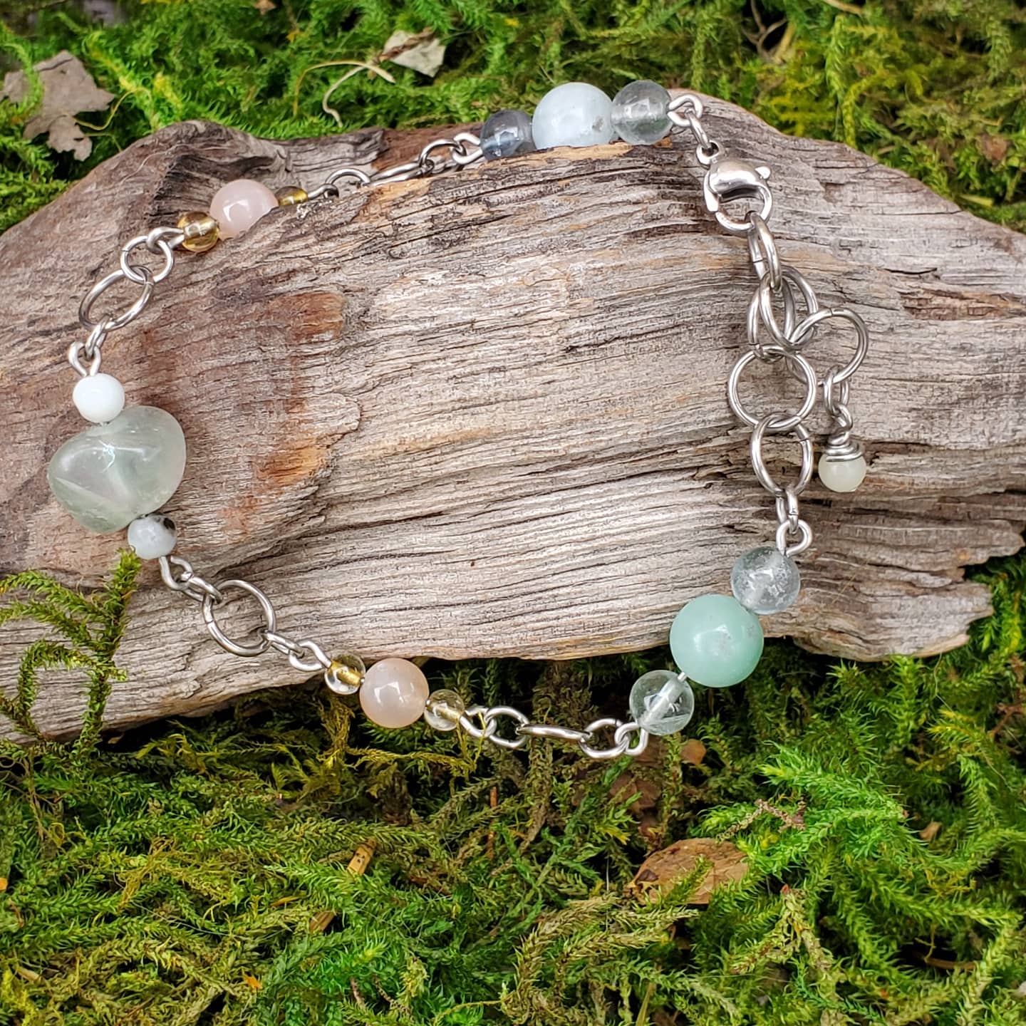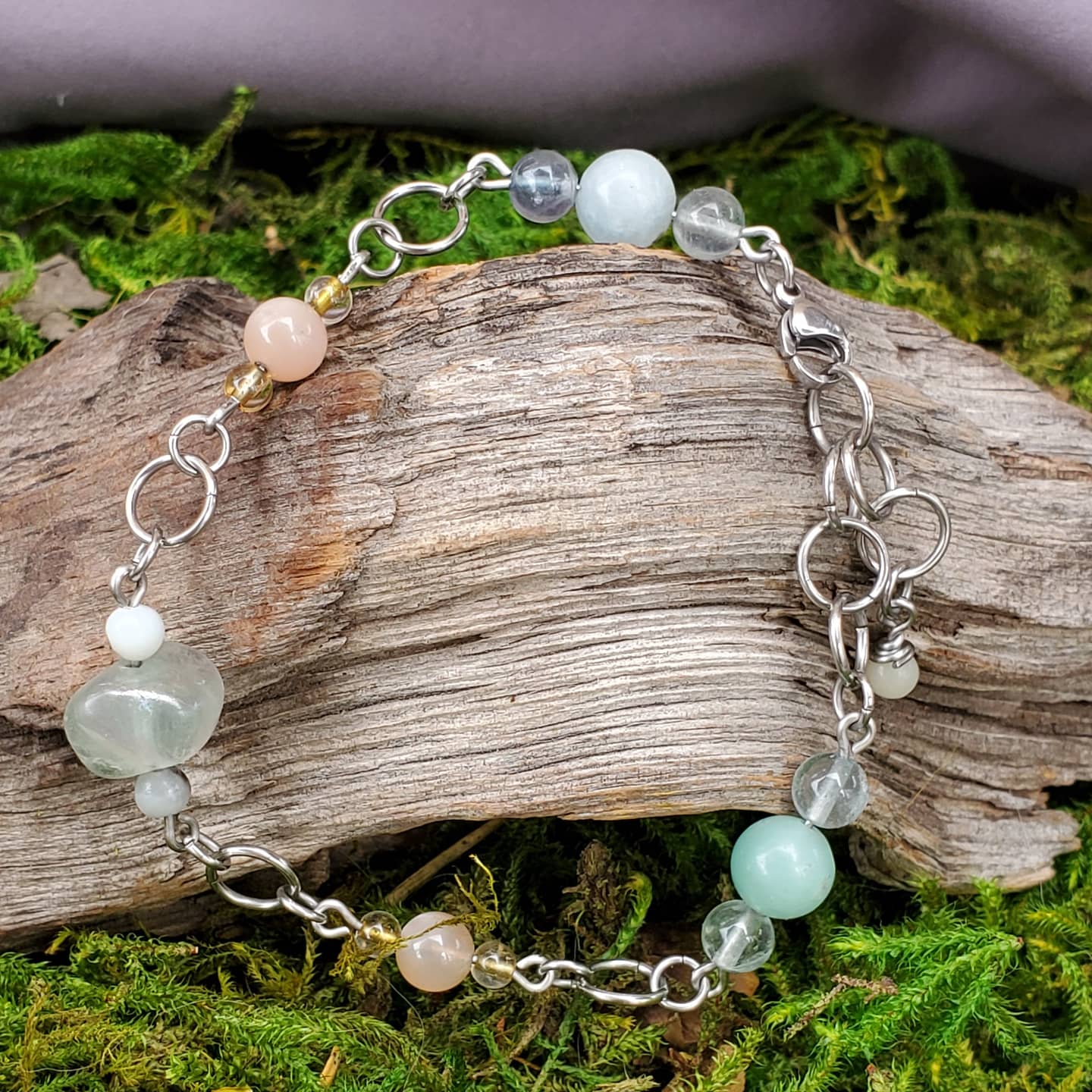 This bracelet is made of stainless steel links, wire, and stainless steel clasp with citrine beads for success, sunstone for personal power, amazonite for courage, and fluorite for mental control. This bracelet won't tarnish or fade!
