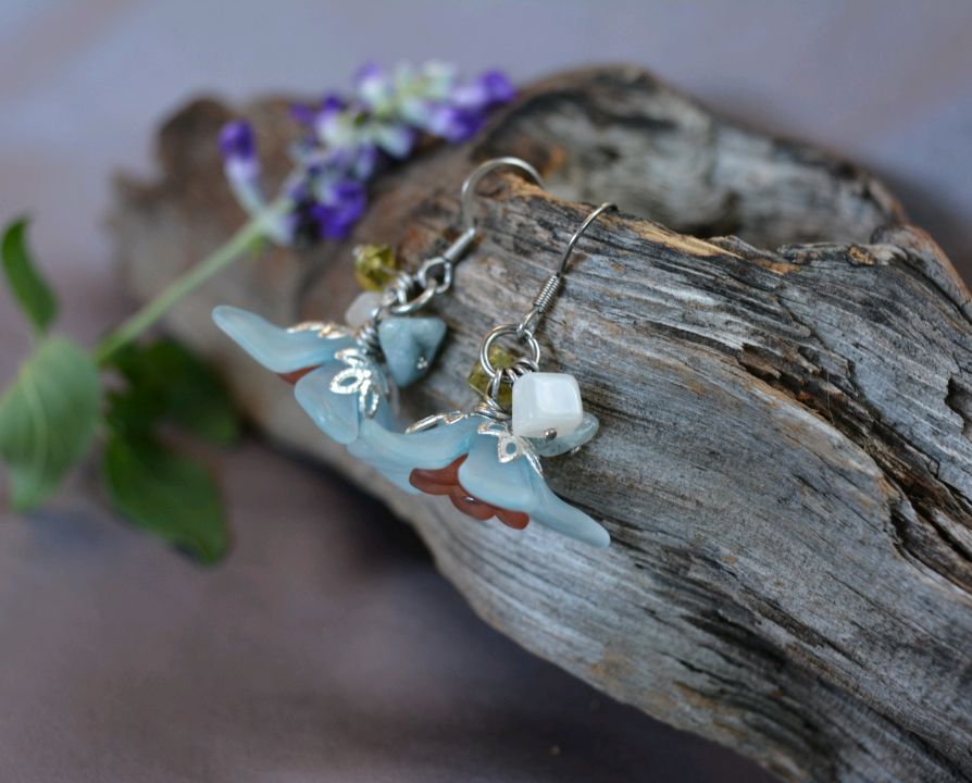 These blue and maroon lucite flowers are accompanied by moonstone, aquamarine, and peridot stones and hypoallergenic stainless steel ear wires.
