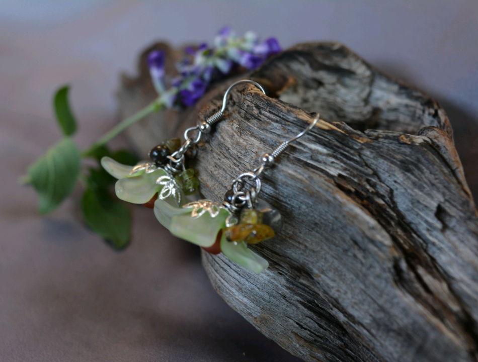 Green and maroon lucite flowers with garnet, moonstone, and peridot on stainless steel ear wires.