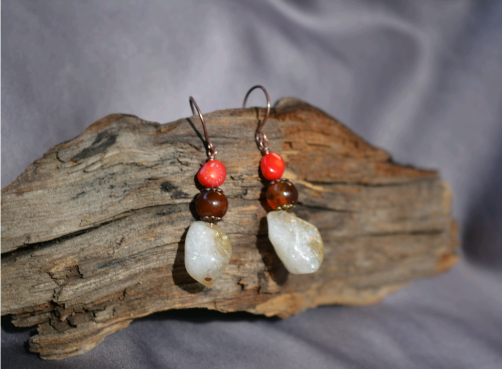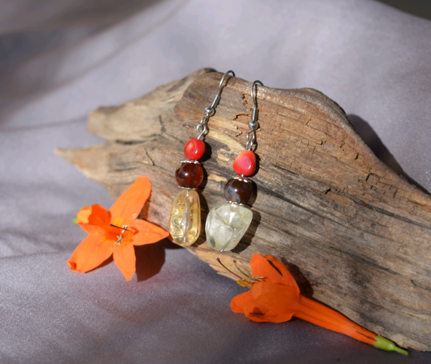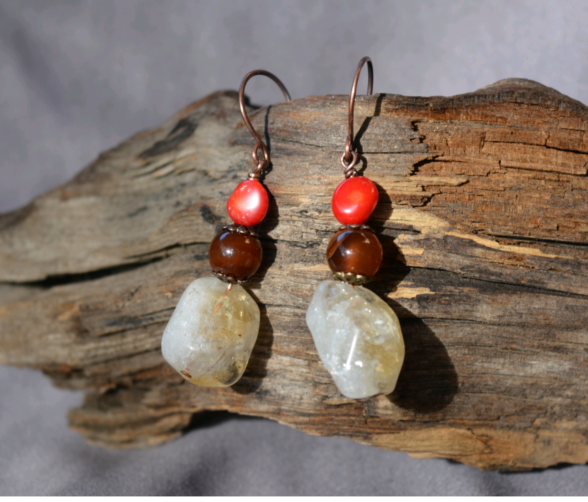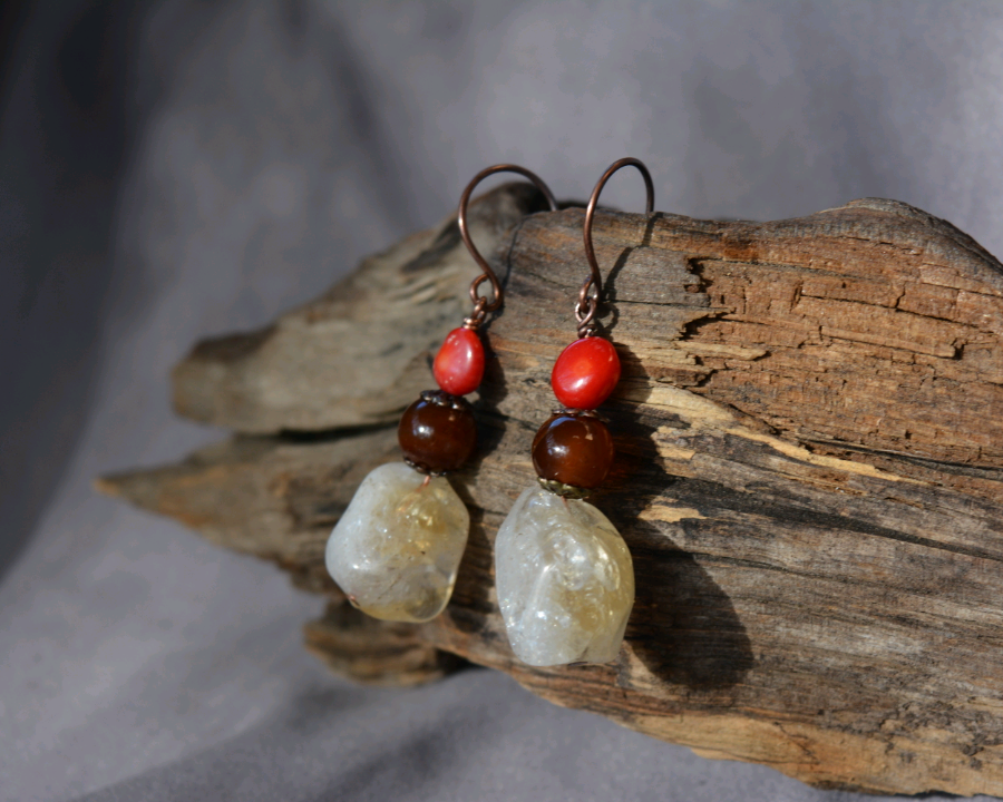 Simple fall inspired earrings. Hand-made antiqued copper fishhook dangle style earrings with Citrine nugget, Carnelian, and Coral beads.