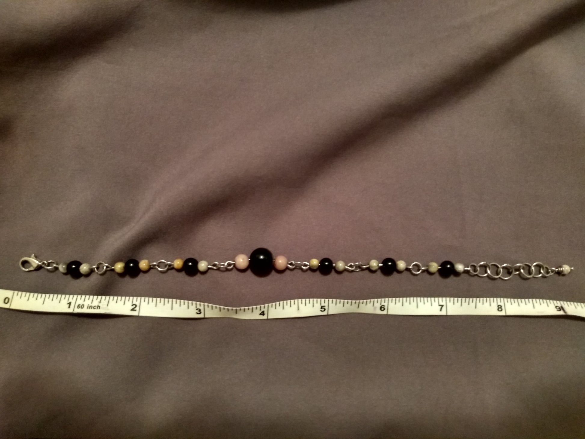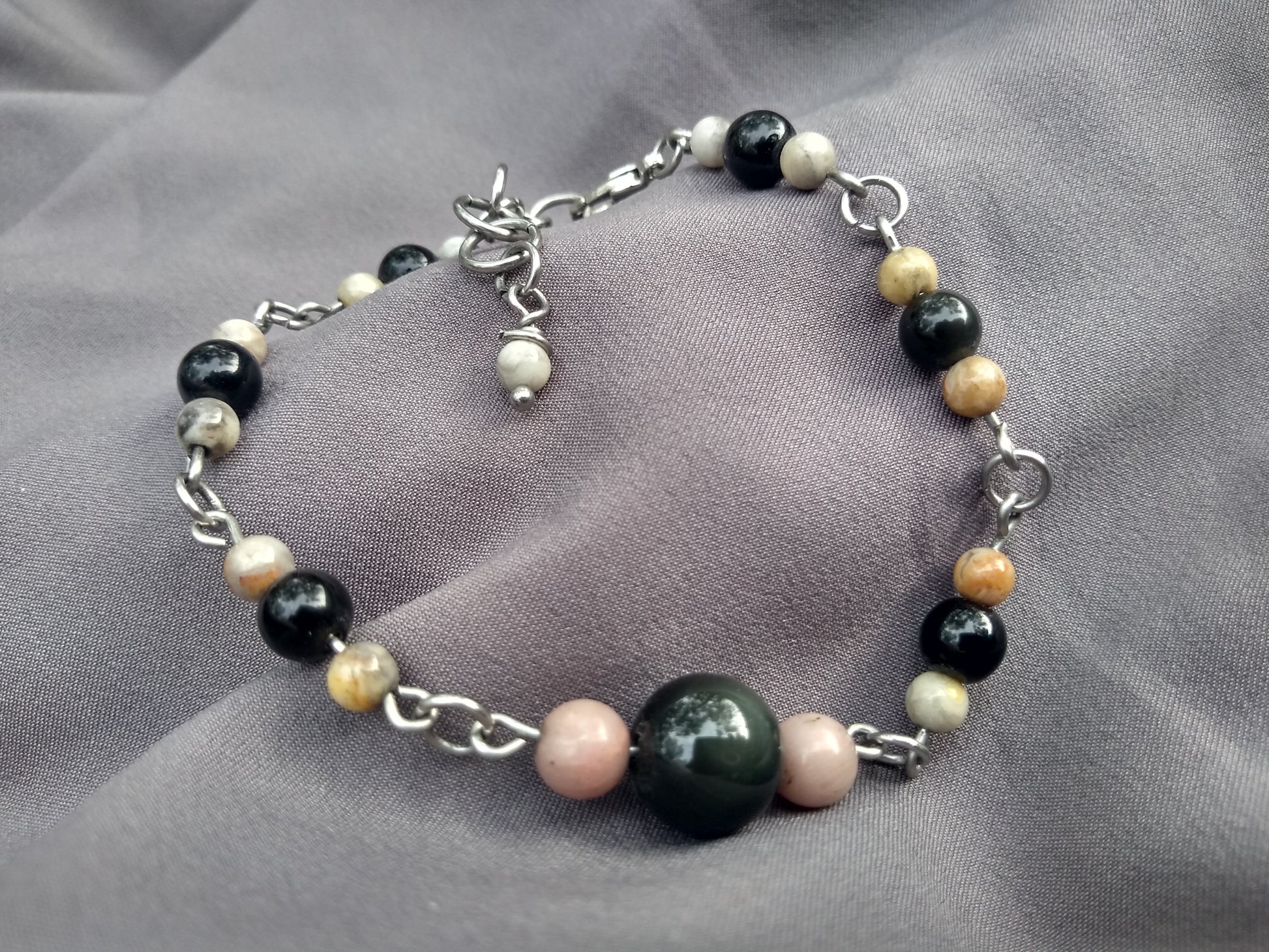 This bracelet is made of stainless steel links with black obsidian beads for protection, pink rhodonite for coming to understand one's own greatest gifts and life purpose, and crazy lace agate is a stone of pure joy, peace, and happiness.
