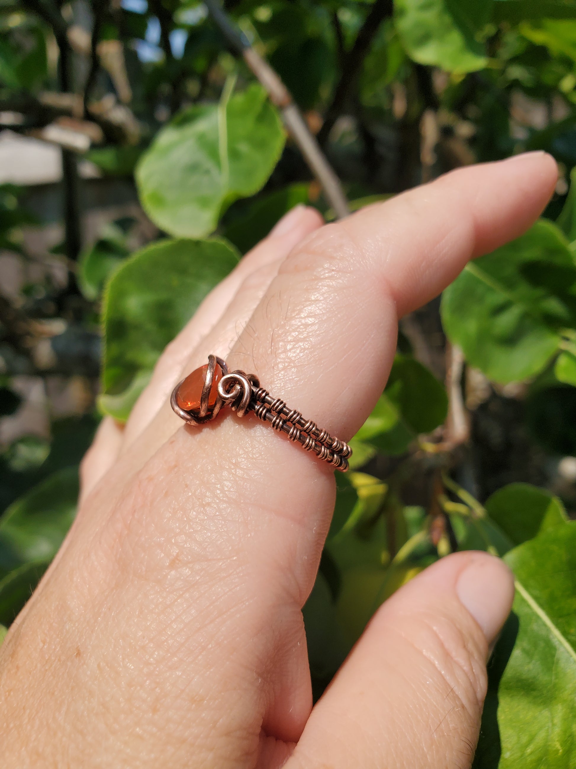 This handcrafted artisan ring is made from copper wire, wrapped around a sparkly facetted Mexican Fire Opal. Size 10.