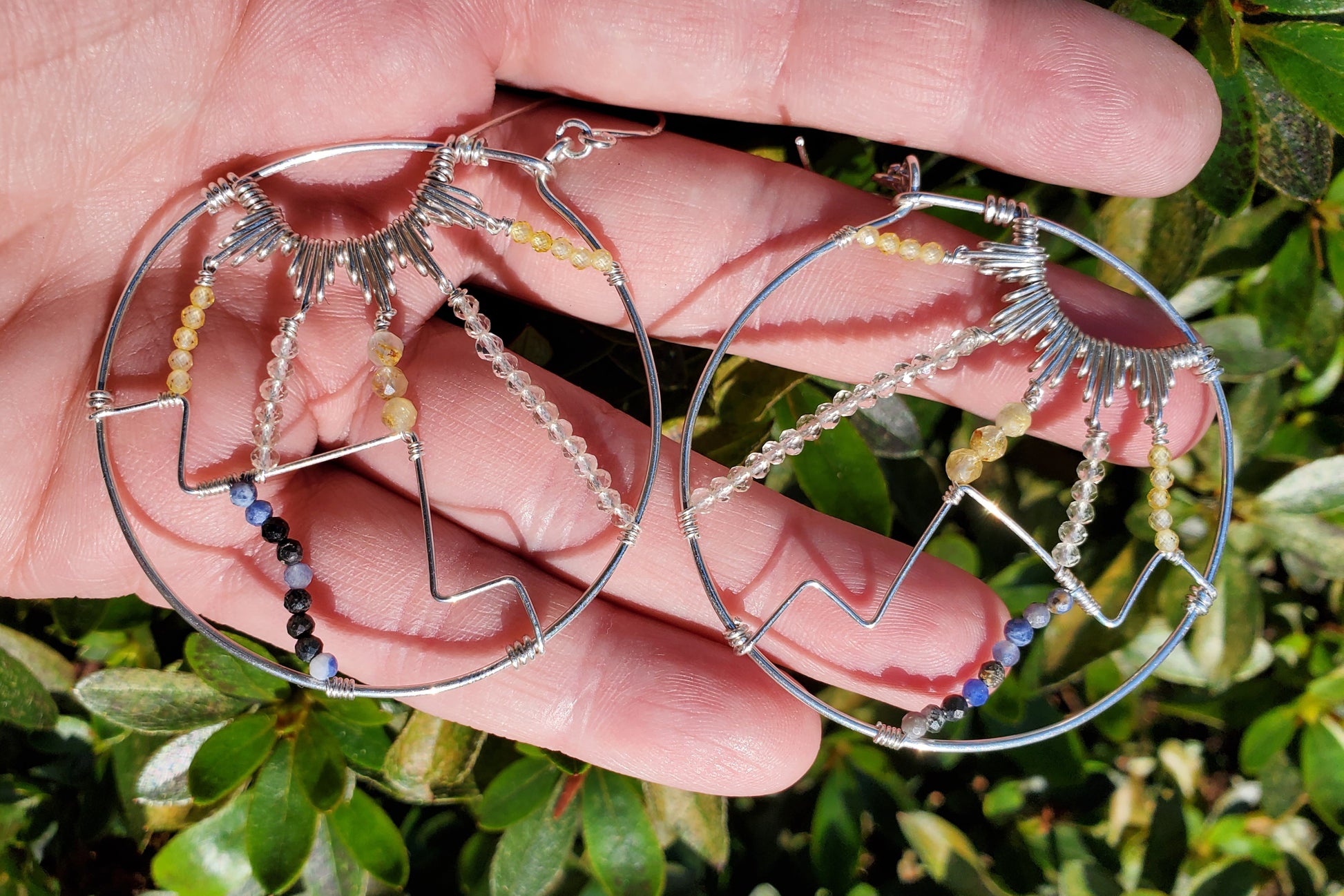 These earrings depict sunshine on mountain slopes with 925 sterling silver wire, citrine for the sun, and sapphire for the river.