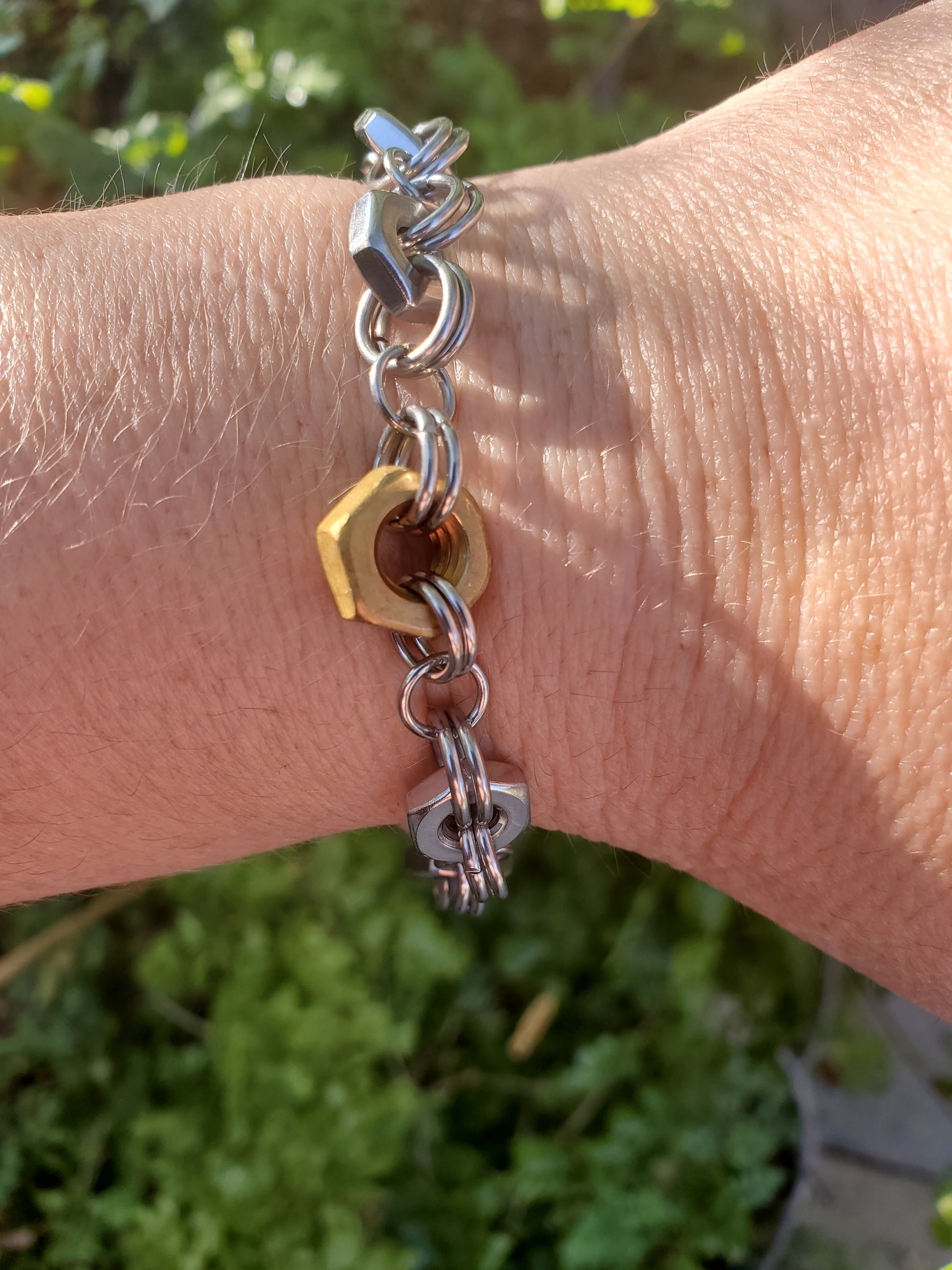 This bracelet is made with stainless steel jump rings and nuts, with a brass nut as a center accent.