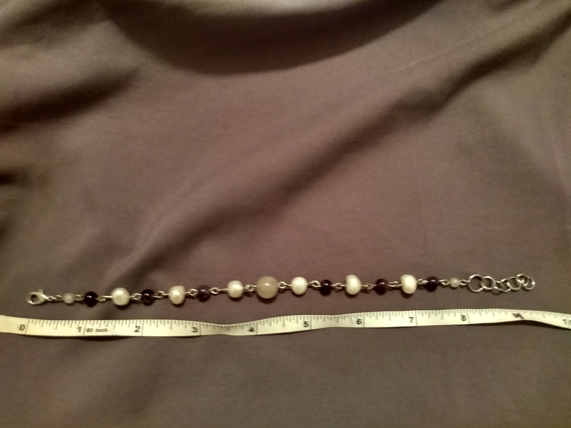 Stainless steel links connect genuine semi-precious gemstones beads of amethyst, rose quartz, and pearl. Bracelet length is 8-9 inches with extension links and lobster clasp closure.