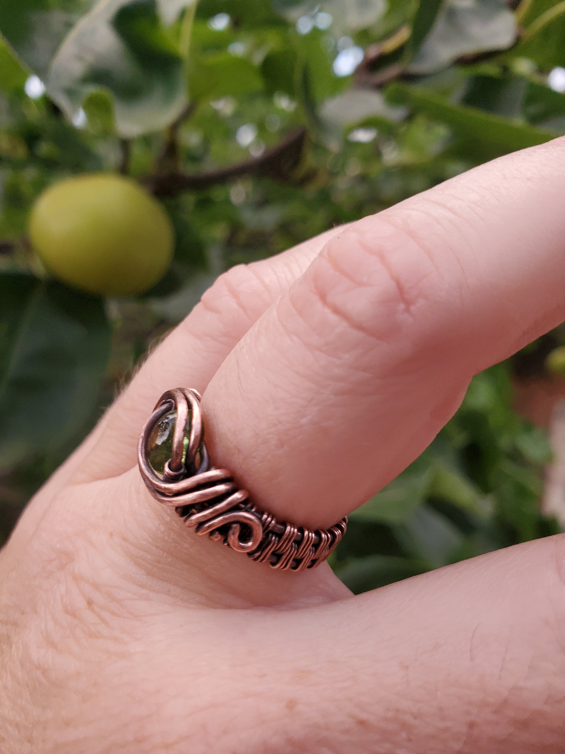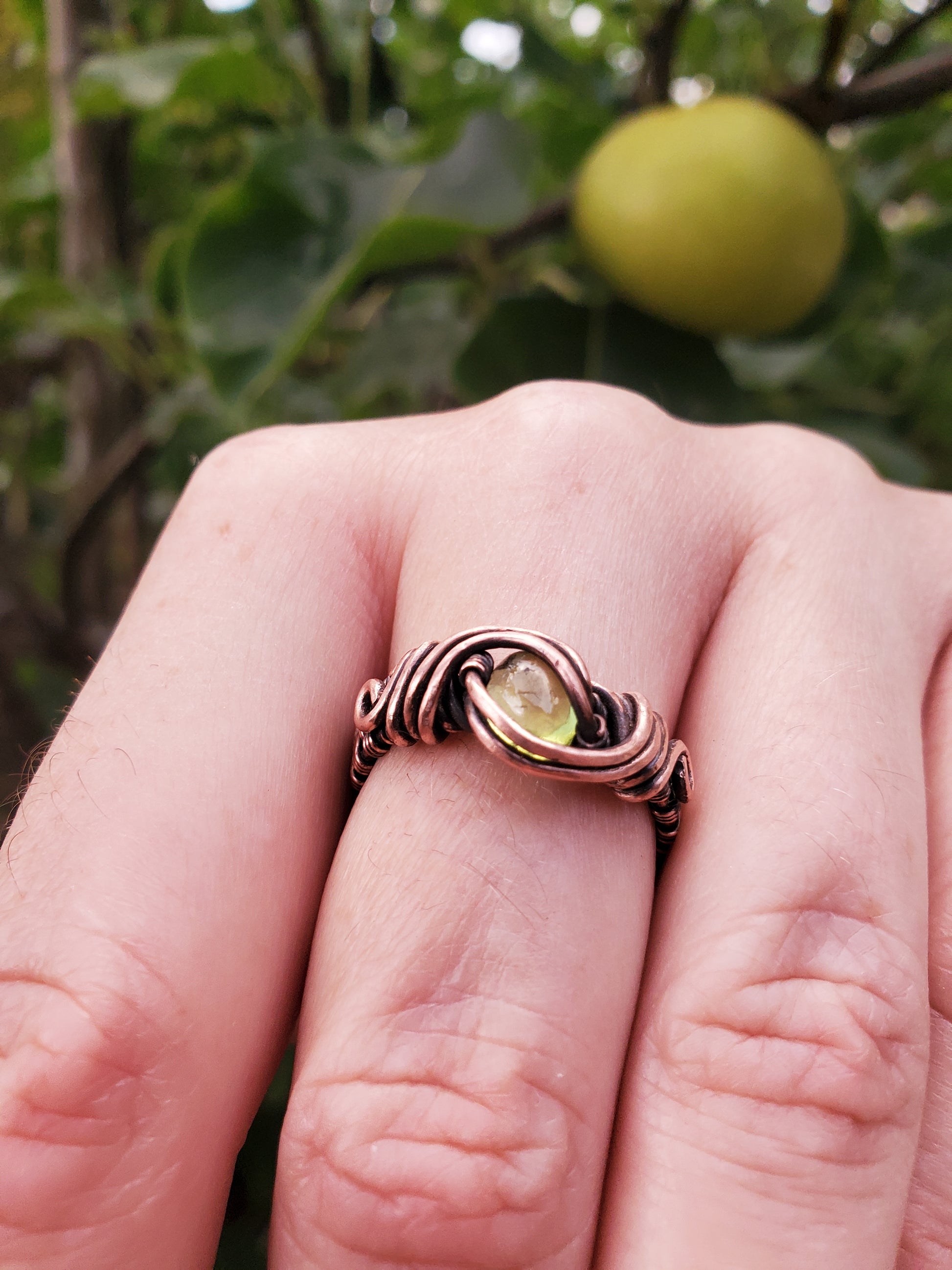 This handcrafted artisan ring is made from copper wire, wrapped around a beautiful green peridot cabochon. Size 9.