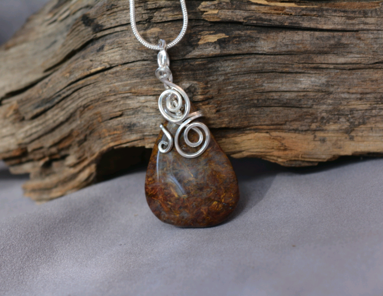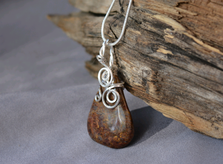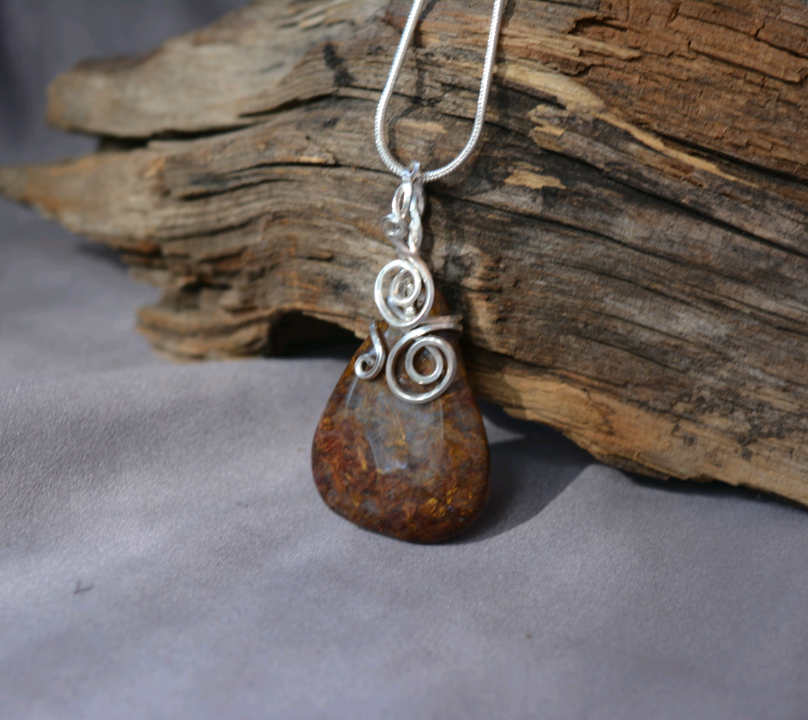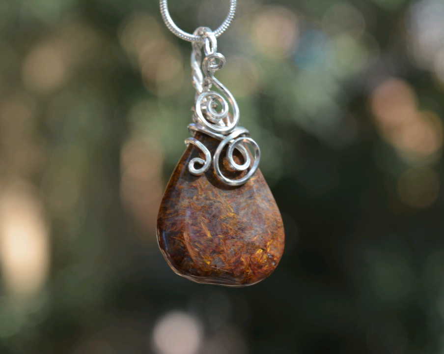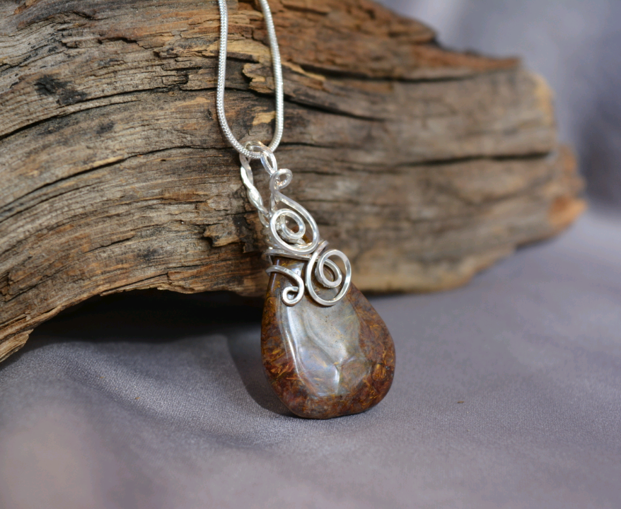 This free-form pietersite is wrapped in solid 925 sterling silver wire.
