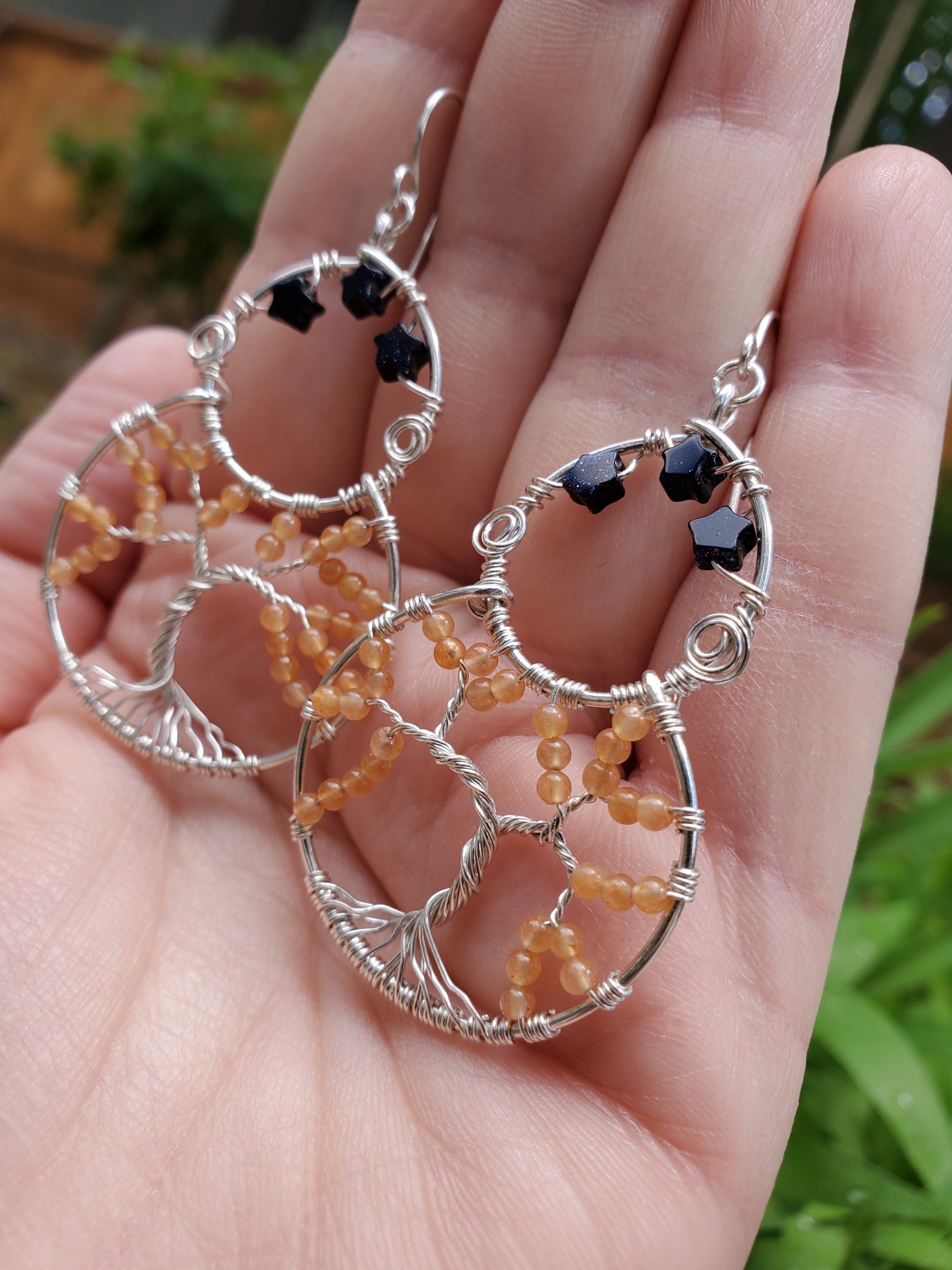 Red Aventurine Treescape earrings in 925 sterling silver with blue goldstone stars.