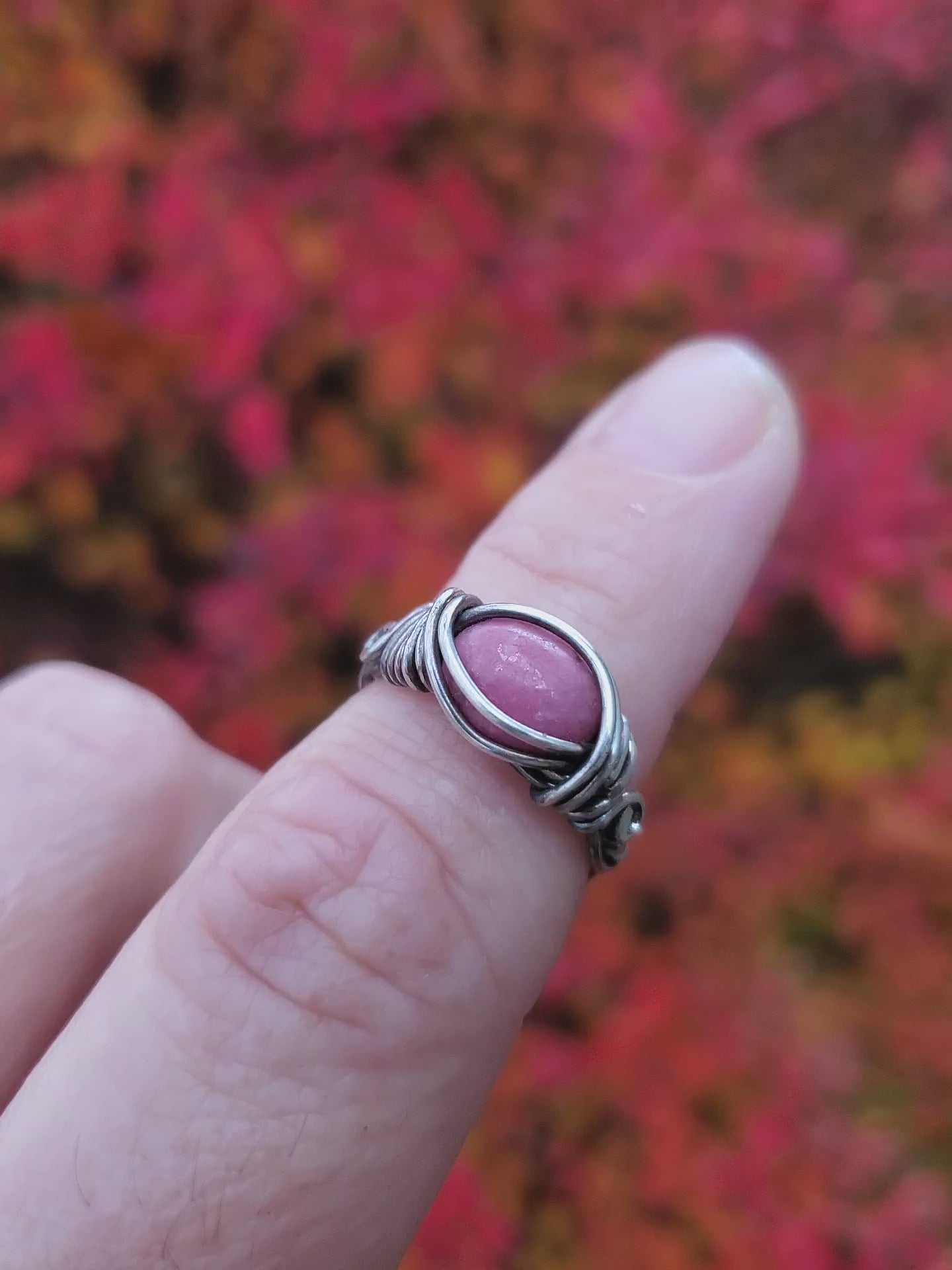 This one of a kind handmade artisan ring features a pink rhodonite cabochon wrapped in braided 925 sterling silver wire that has been hammered, antiqued, and polished. Size 6.
