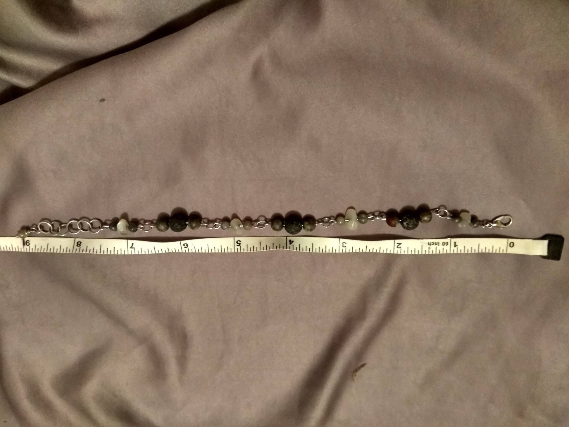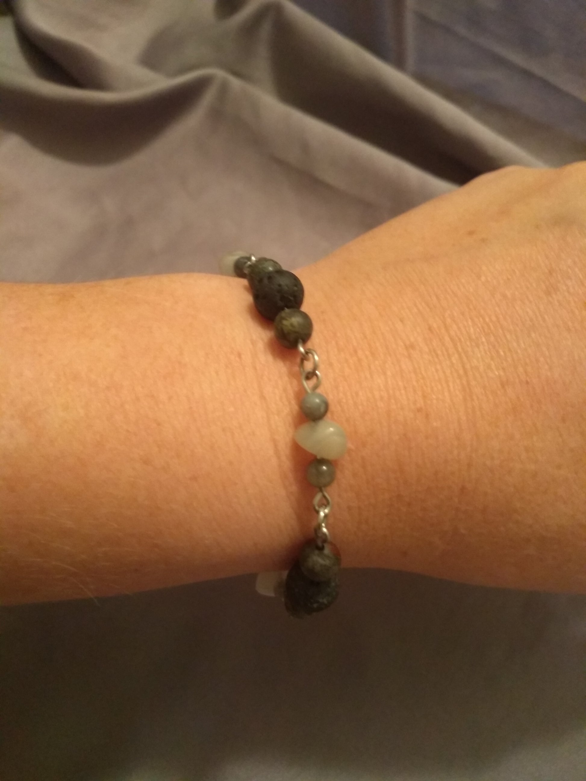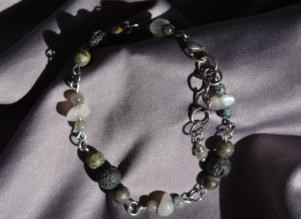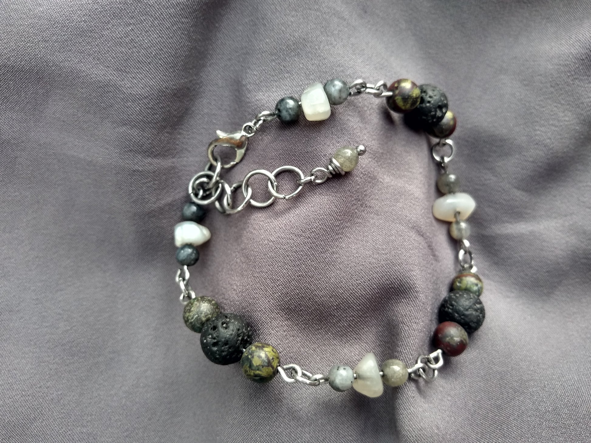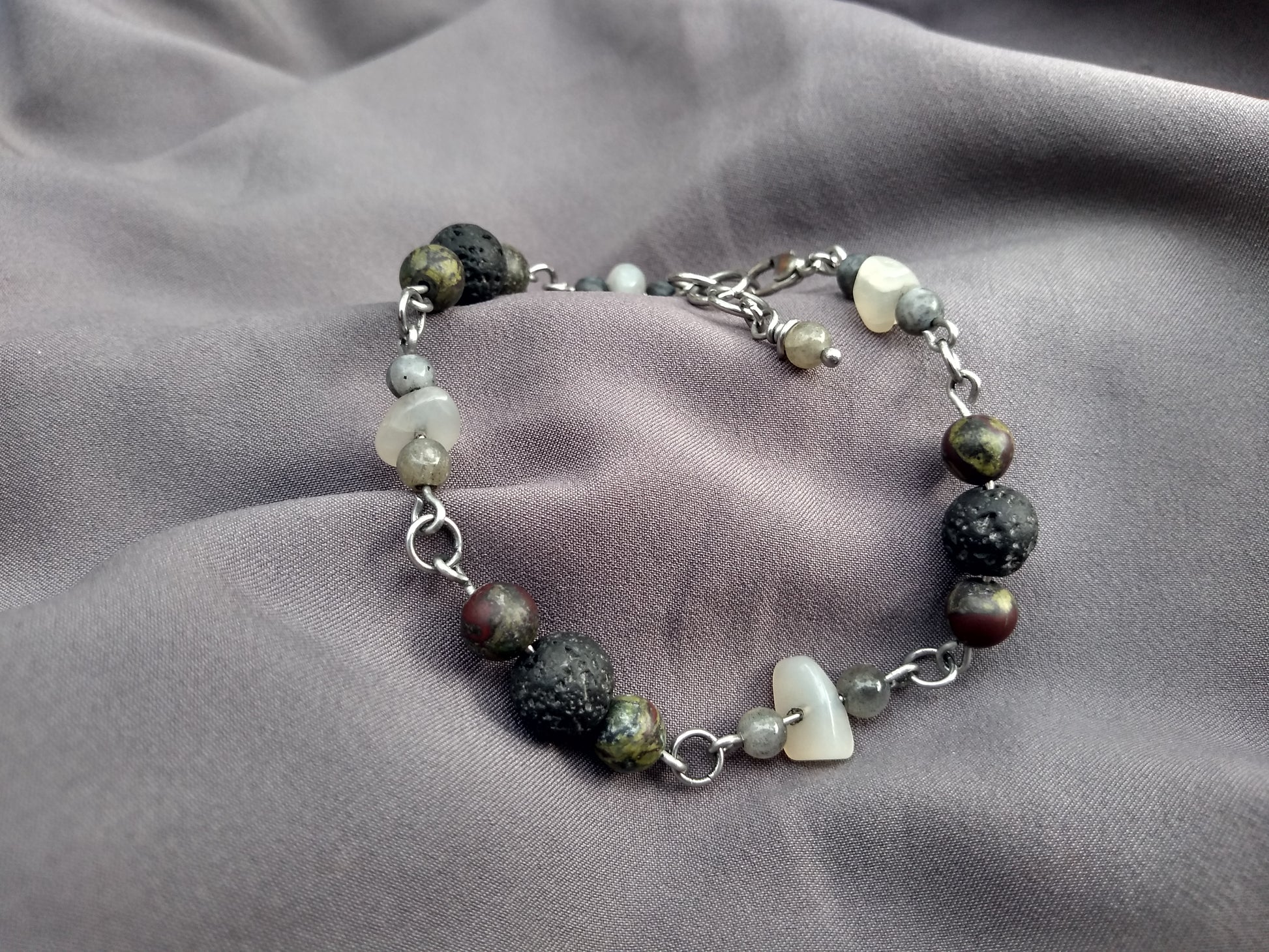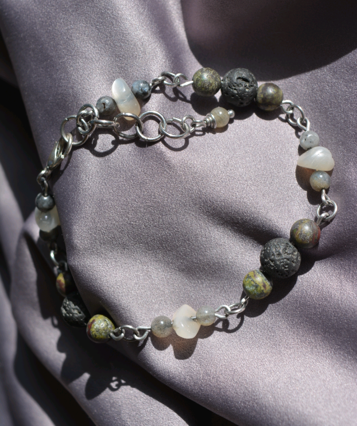 Stainless steel links carrying lava rock, bloodstone, labradorite, and moonstone for a powerhouse bracelet that is durable, and carries some serious energy.