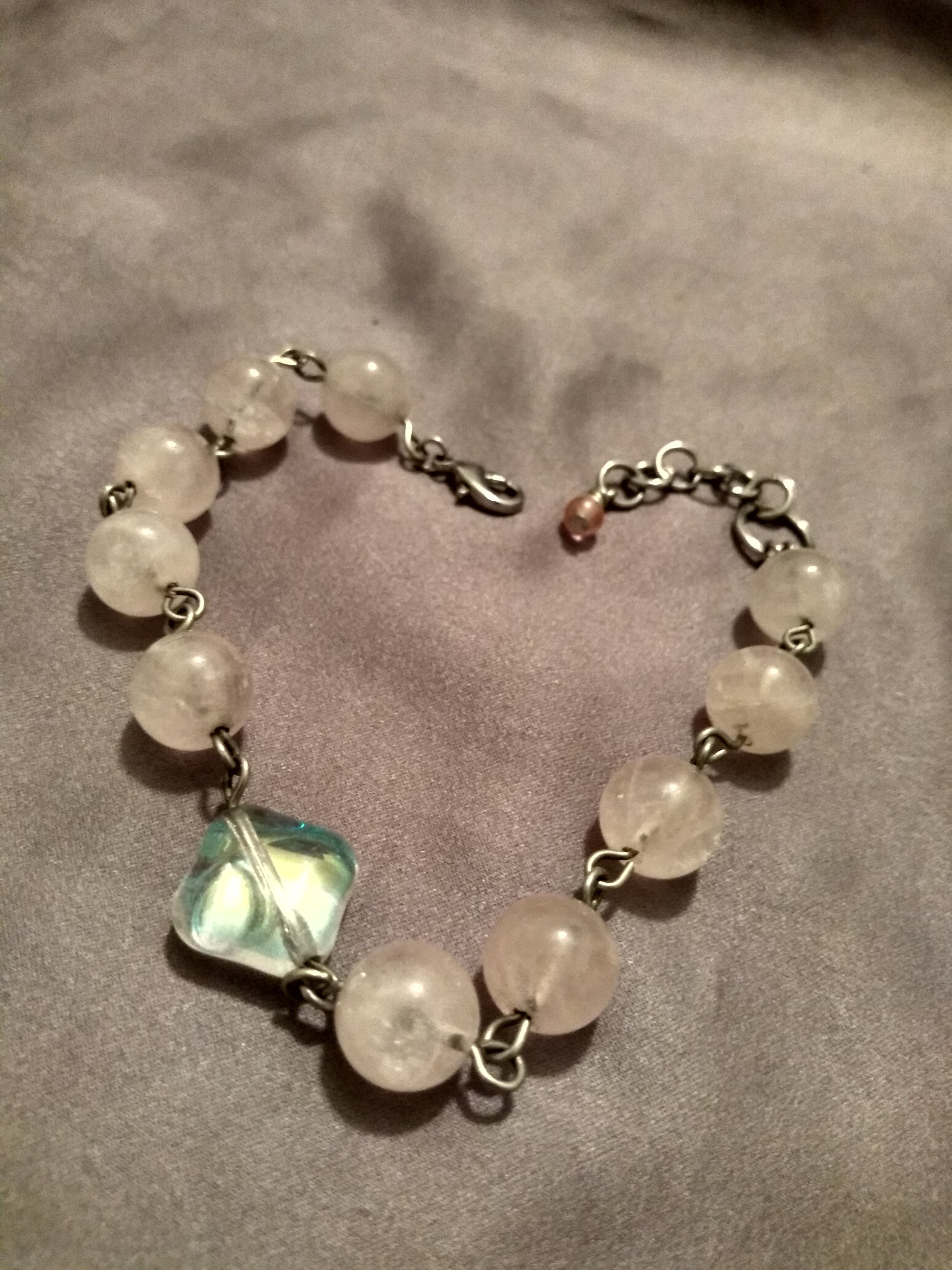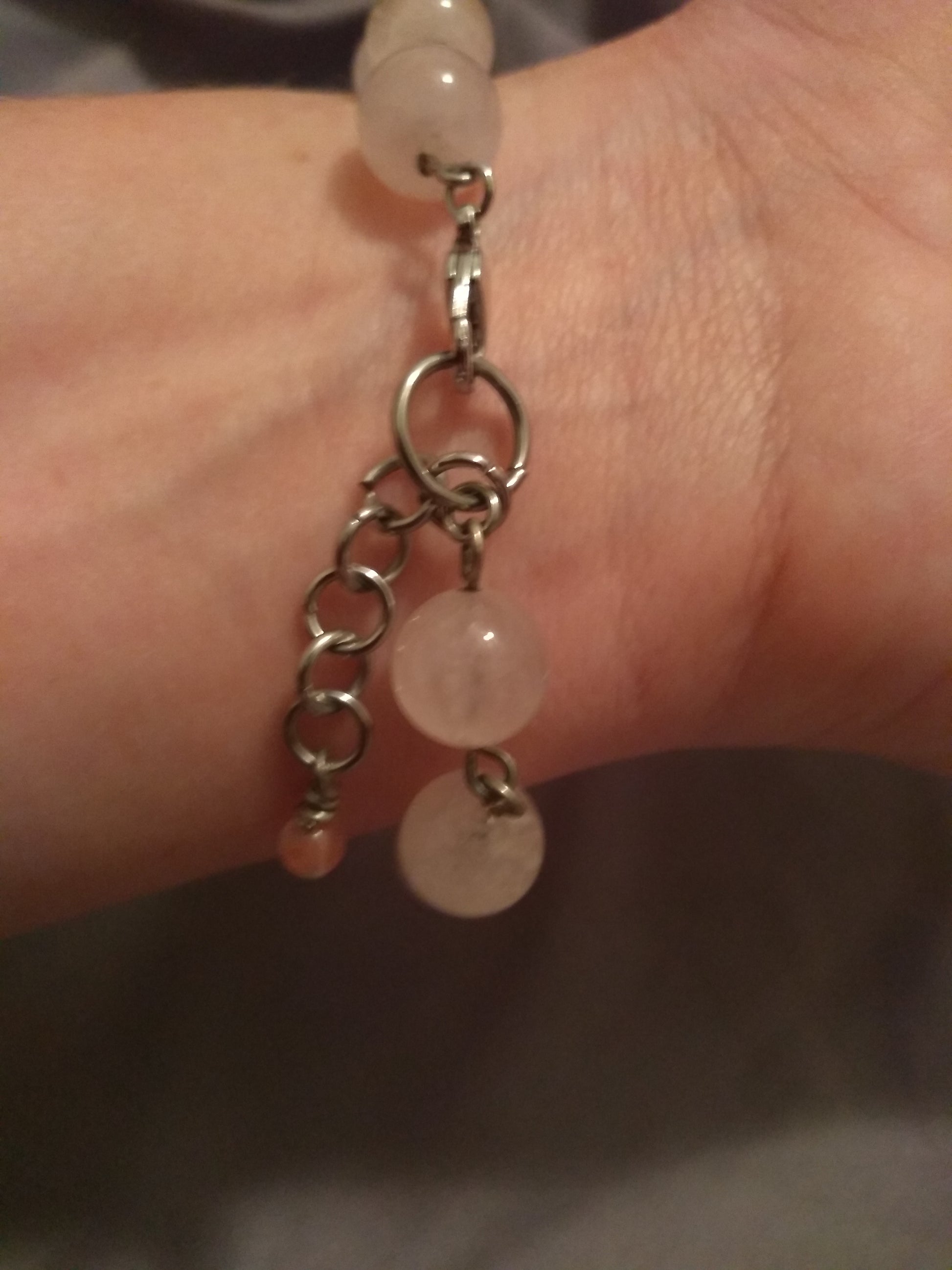 Simple, elegant, and durable, rose quartz beads on stainless steel wire with a AB Designer glass bead focal point.