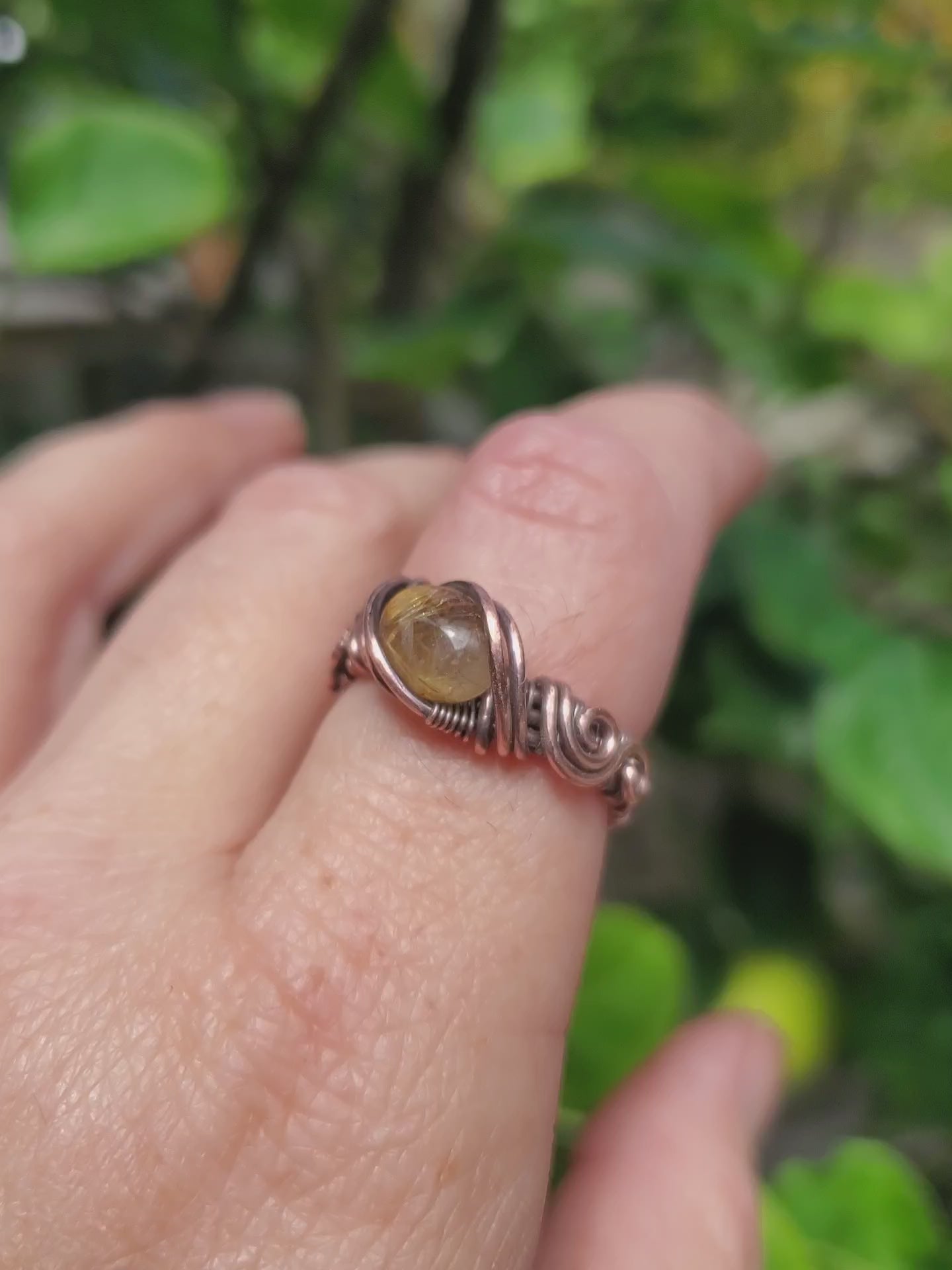 This one of a kind ring has a rutilated quartz cabochon set in handcrafted artisan wrapped, antiqued, and polished copper wire. Size 9.