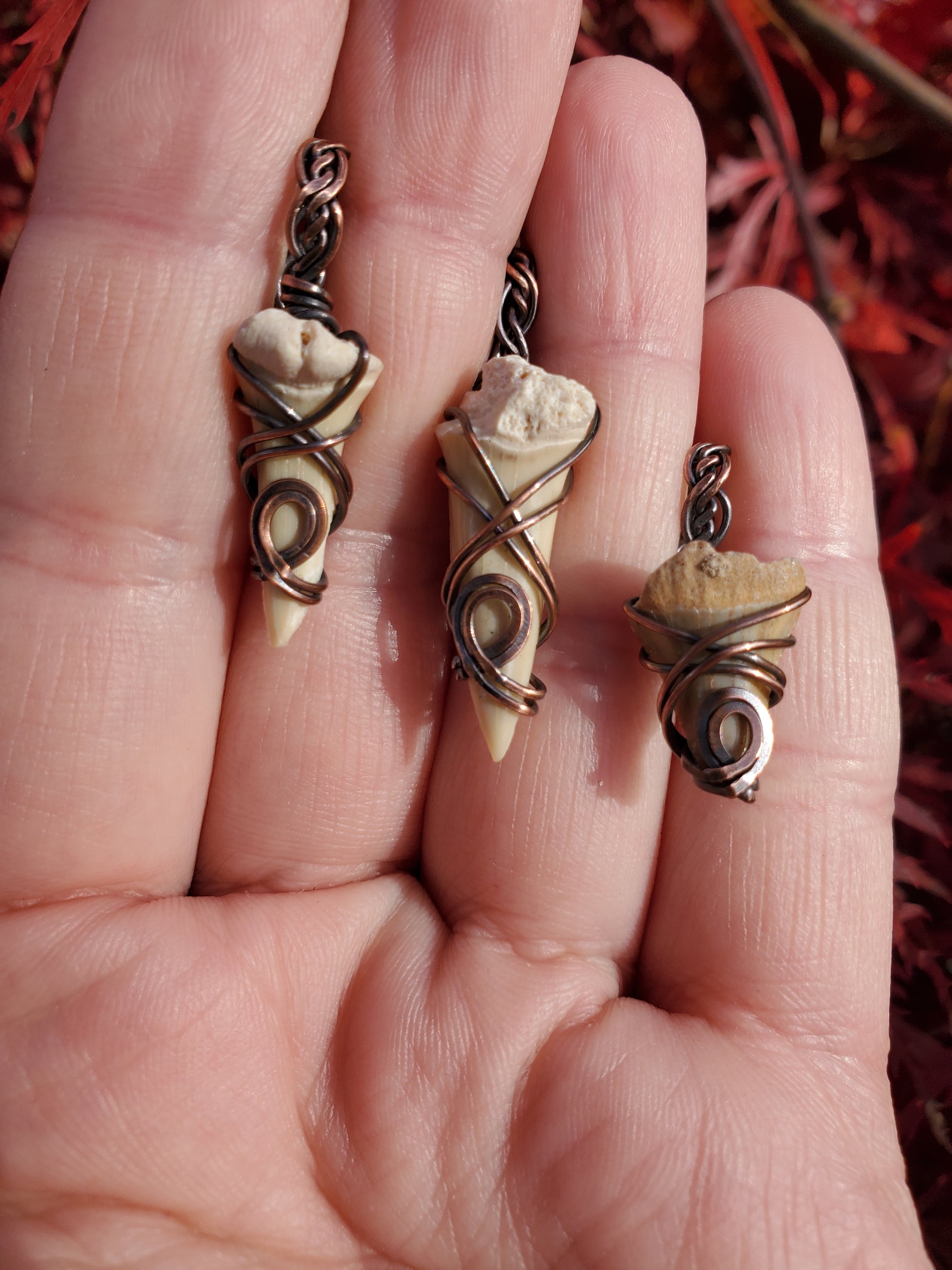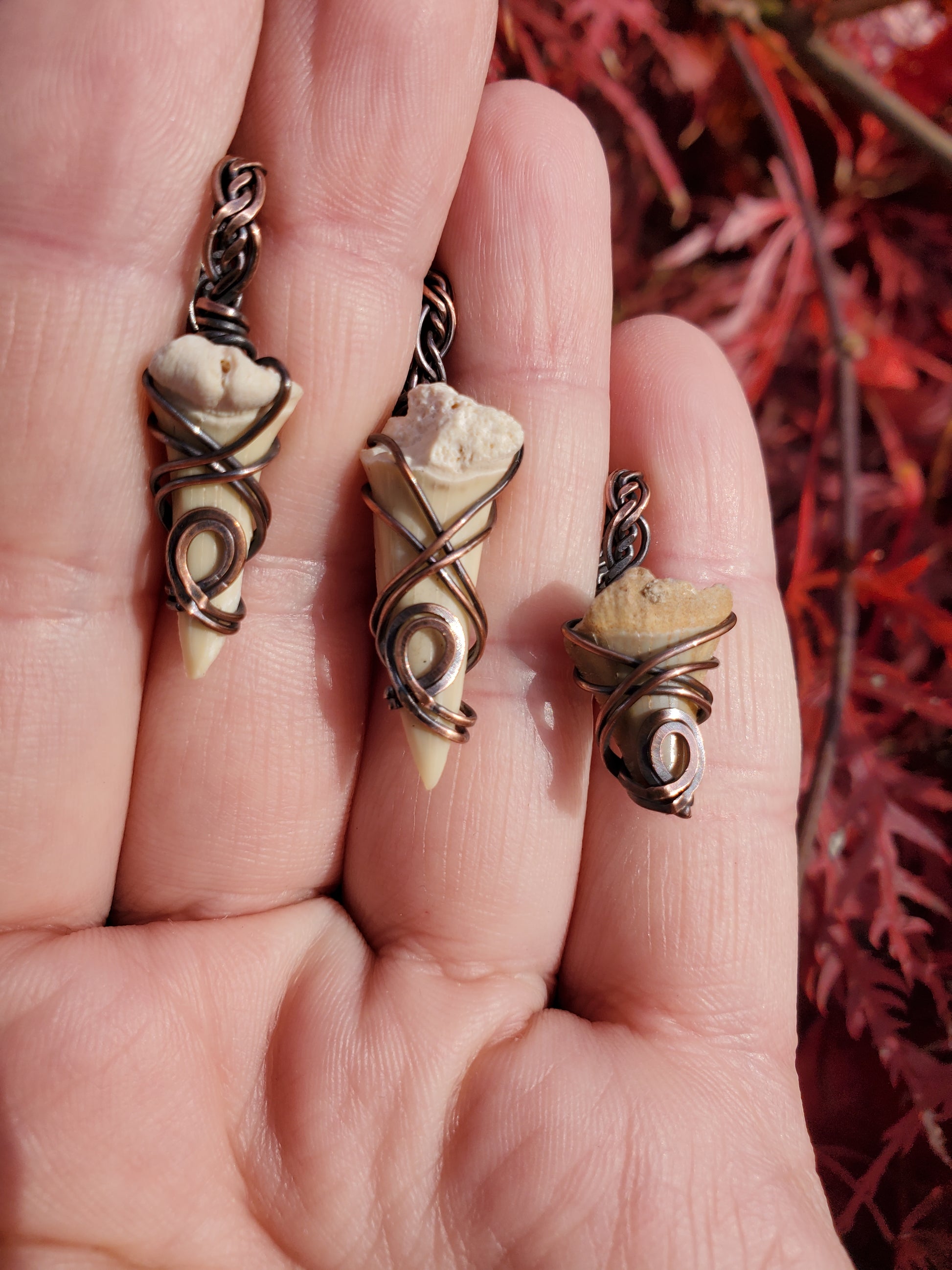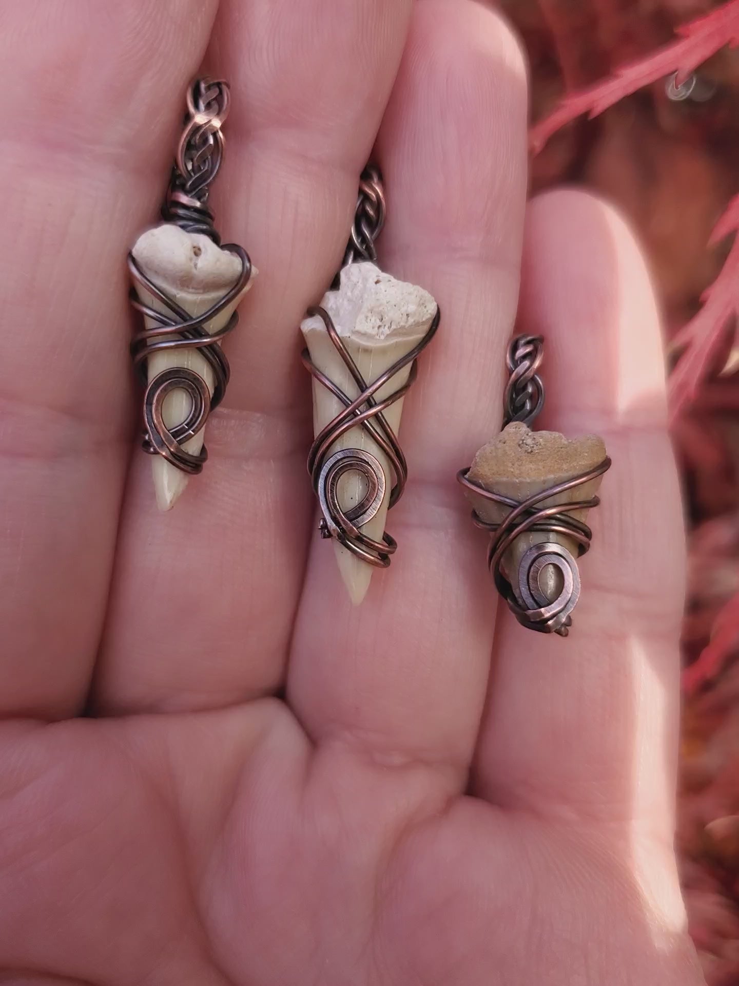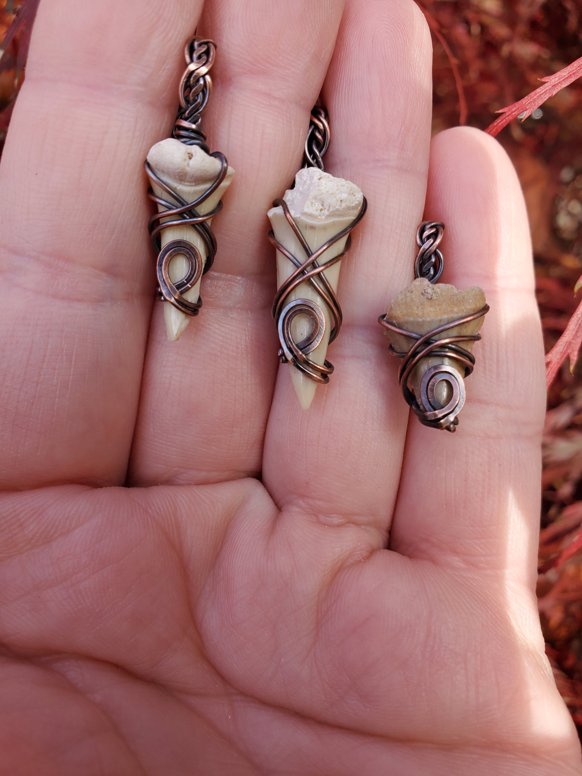 This listing is for a shark tooth wrapped in copper wire with a complimentary black cord. All of this jewelry is handmade by me.