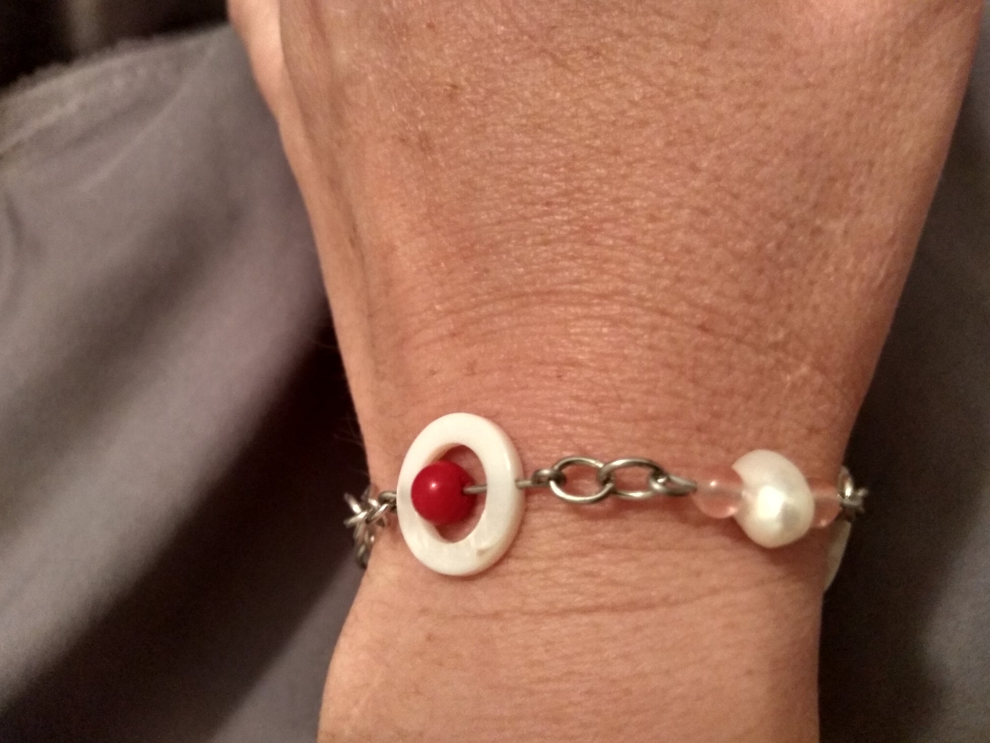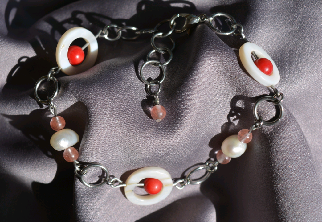Stainless steel links connect shell rings, red coral, pearl, and rose quartz. This bracelet evokes imagery of a siren song, classy, elegant, and functional.