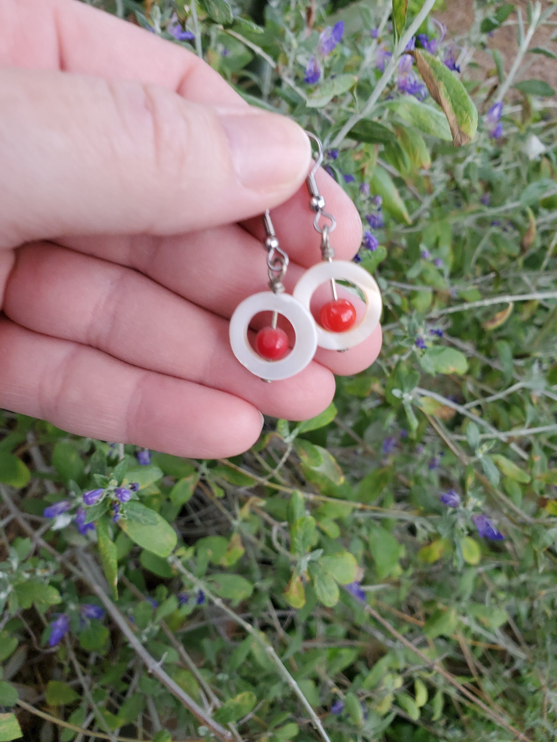 Genuine shell and red coral dangle from surgical steel fishhook earrings on stainless steel wire.