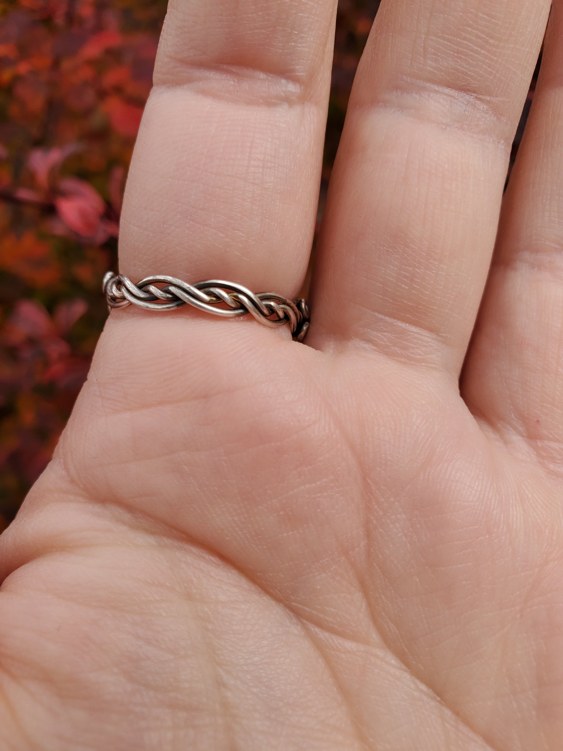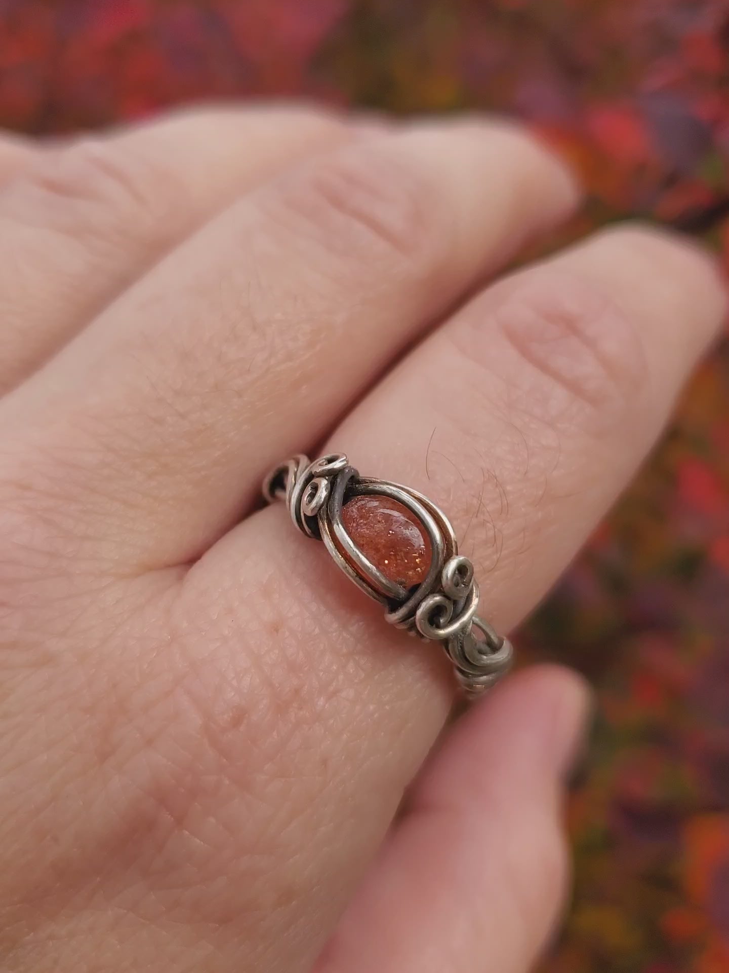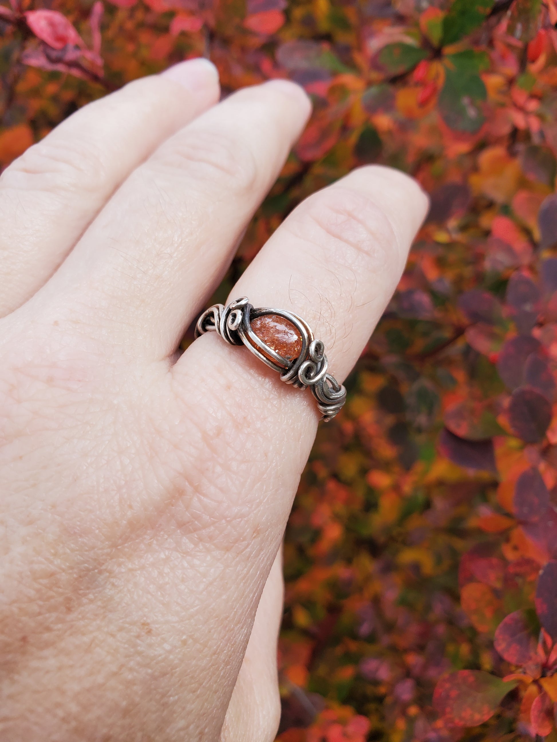 This one-of-a-kind ring is made with a glittery orange sunstone cabochon and wrapped in braided 925 sterling silver. It has been hammered, antiqued, and polished. Size 9.5.