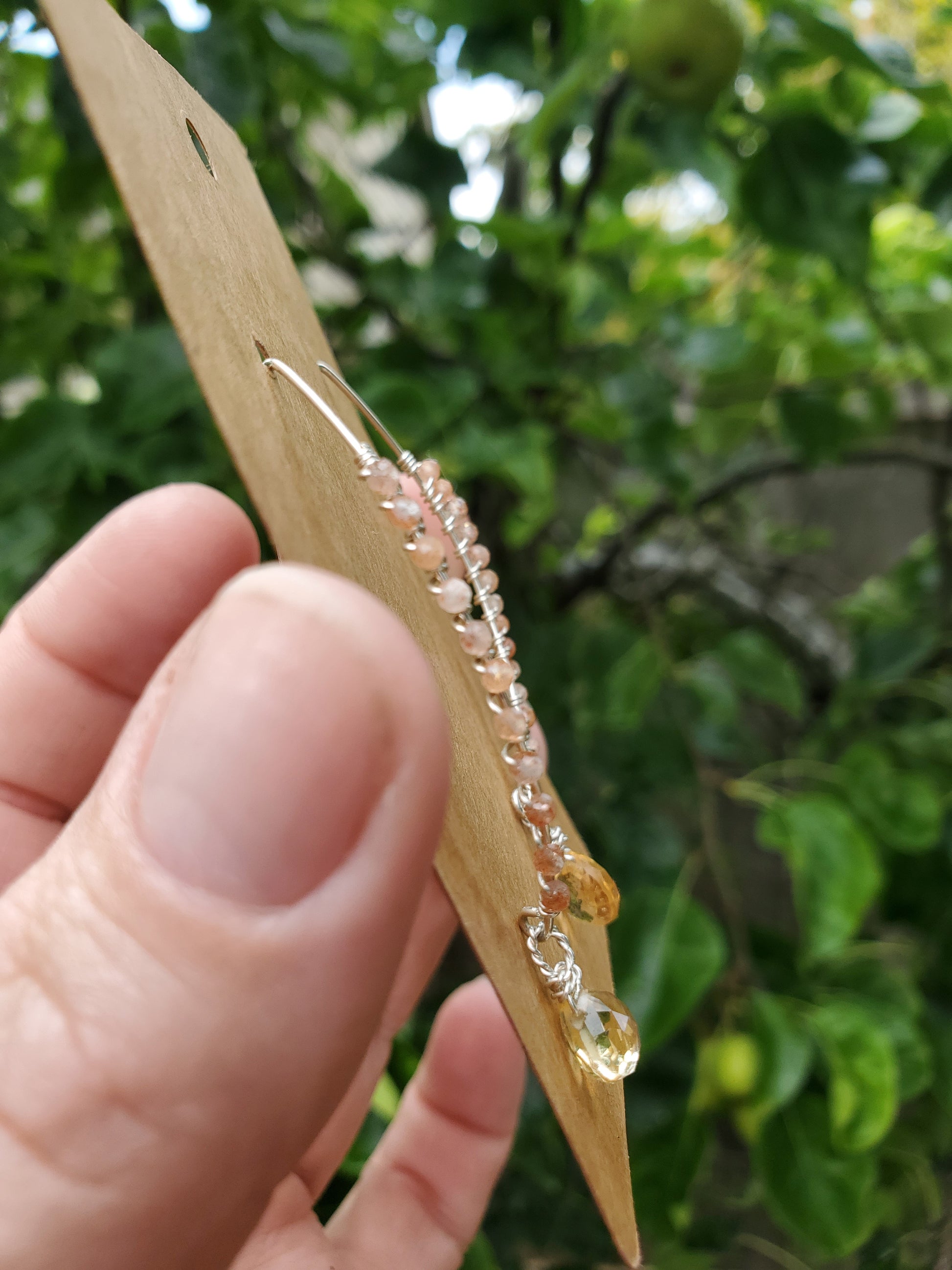 2mm facetted round sunstone beads and AAA facetted citrine briolette beads in 925 sterling silver marquise ear wires make up these stunning earrings.