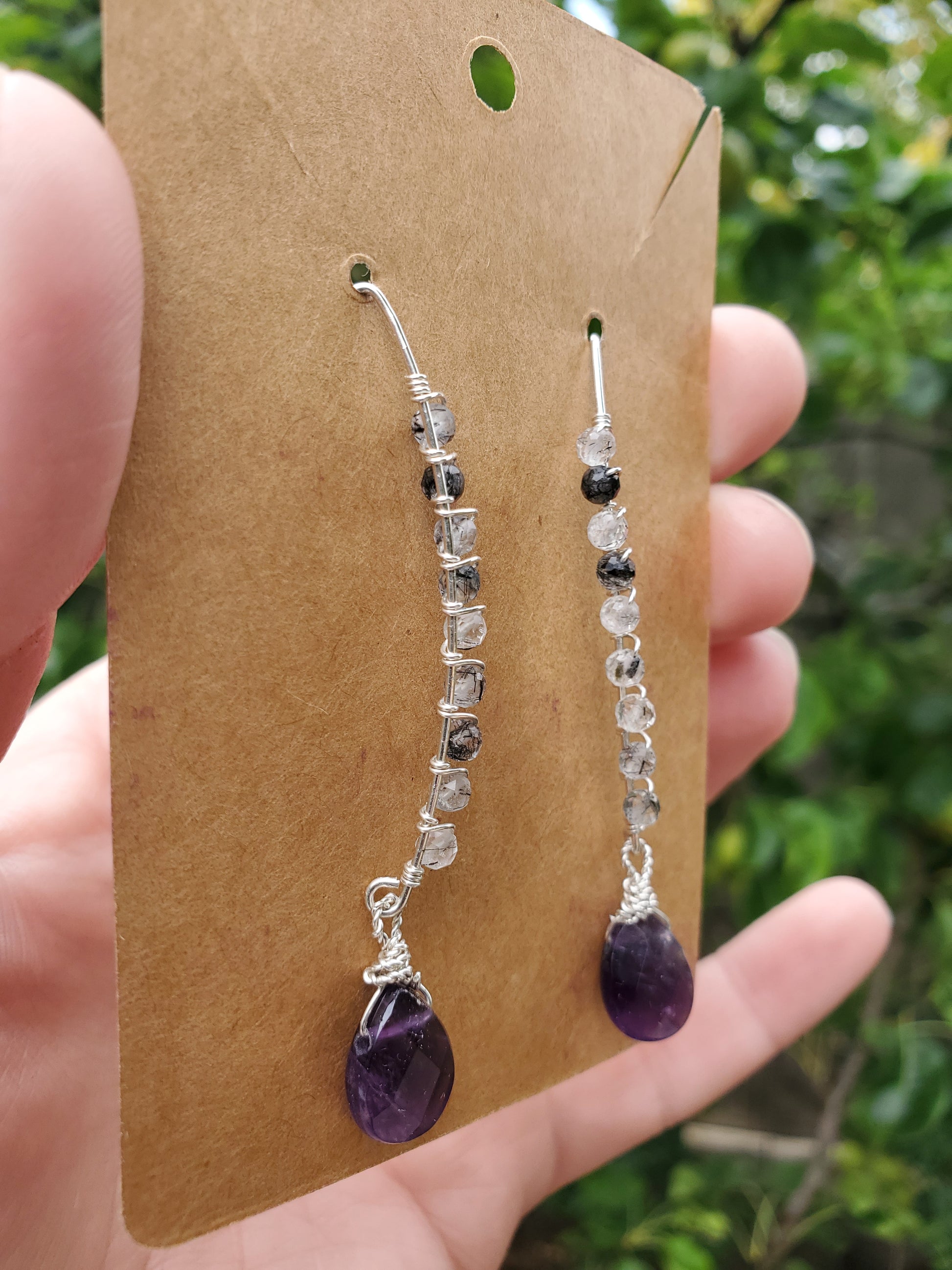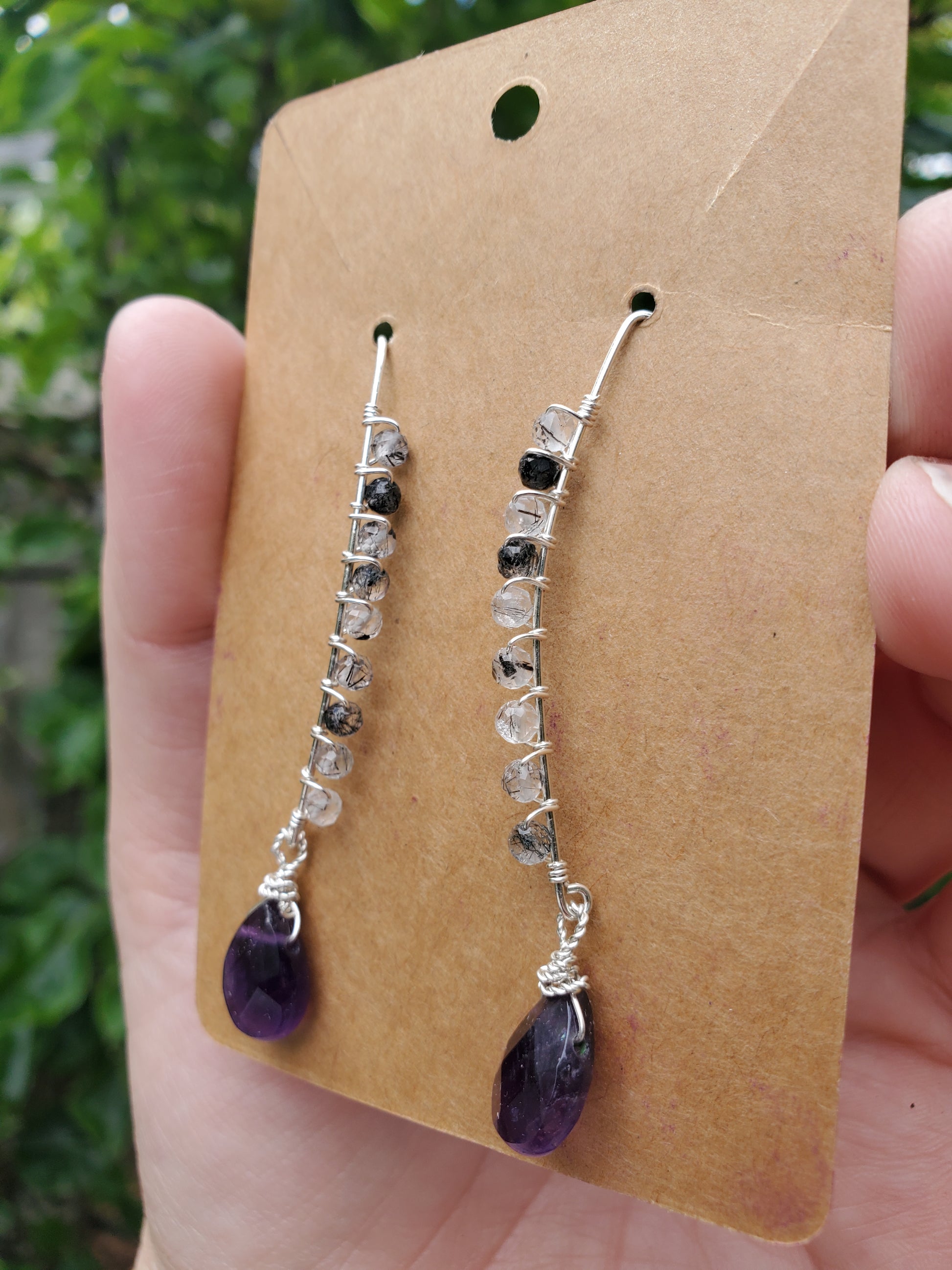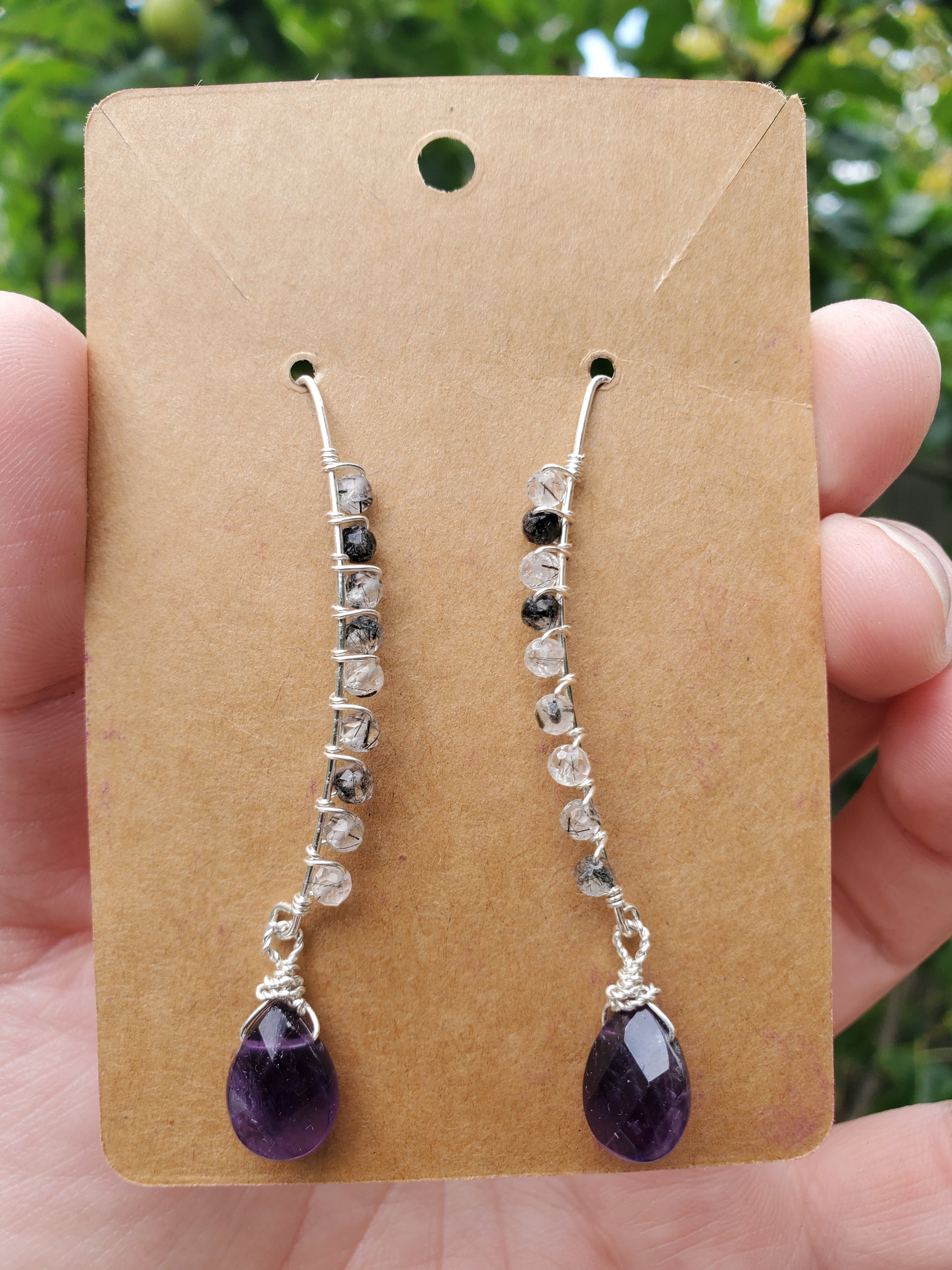 3mm facetted round tourmalinated quartz beads and facetted briolette amethyst beads on 925 sterl9ng silver marquise earwires make up these eye-catching earrings.