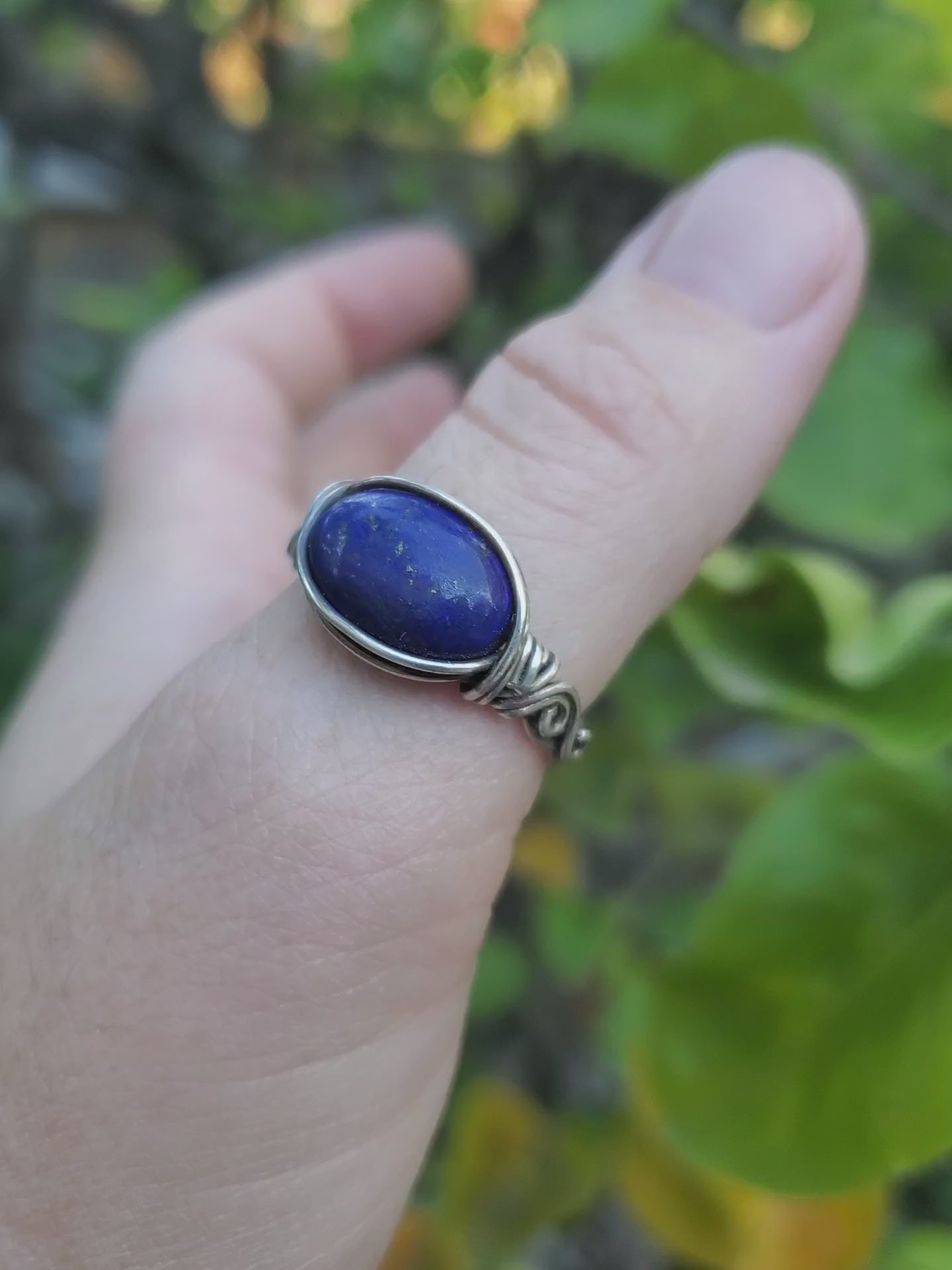 This ring has a high quality lapis lazuli cabochon secured in braided sterling silver wire. Size 12.