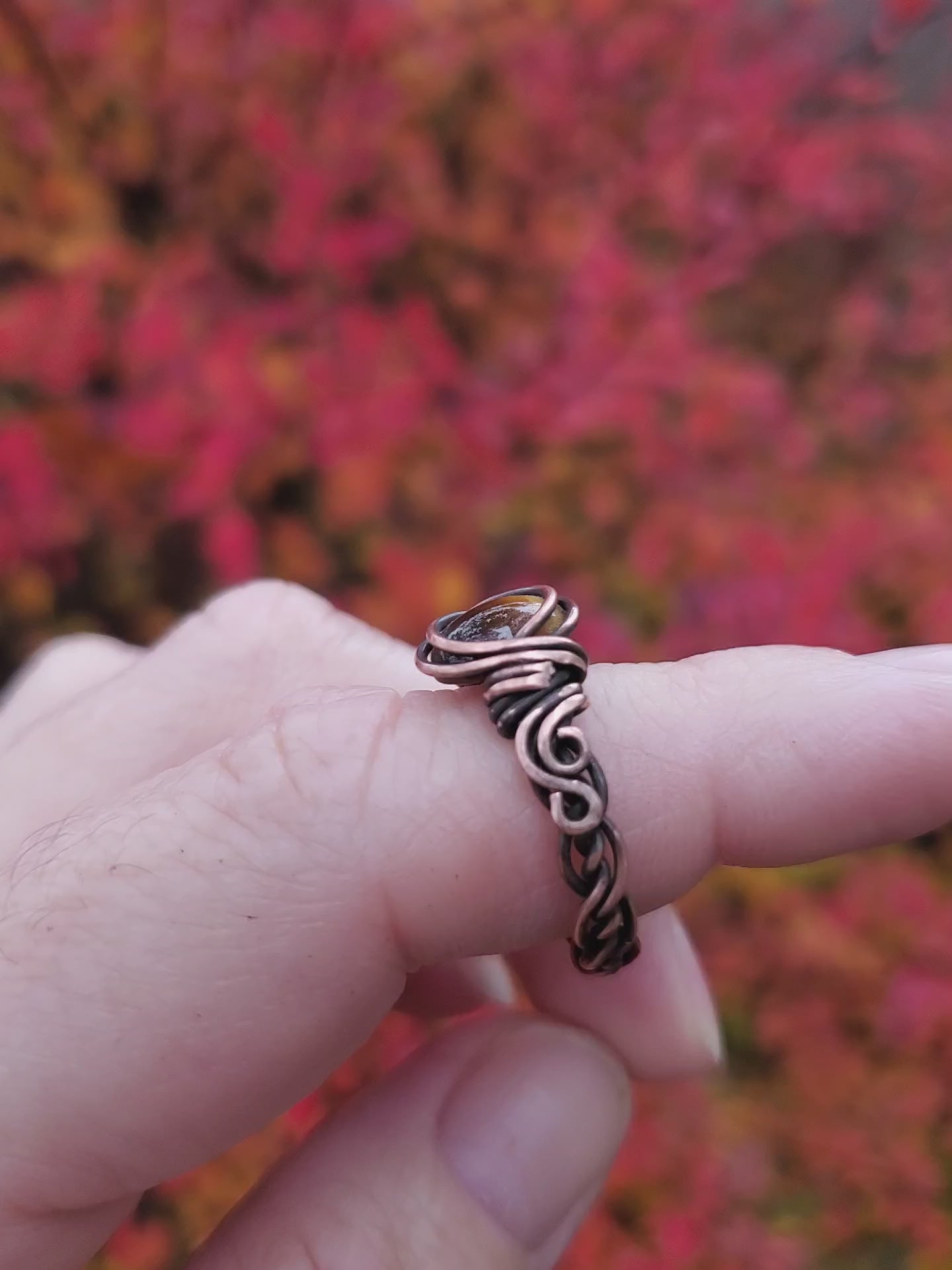 This one if a kind handcrafted ring has a vibrant yellow Tigers Eye cabochon wrapped in braided copper wire that has been hammered, antiqued and polished. Size 6.5.